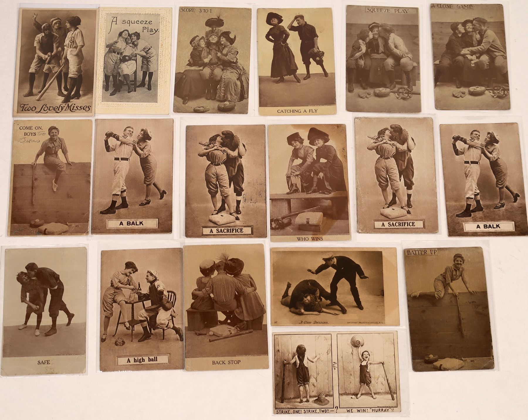 Fifteen postcards featuring humorous and bawdy baseball themes. The staged photos are accompanied by witticisms. Some cards are blank some used. Please see photos for detail and condition.