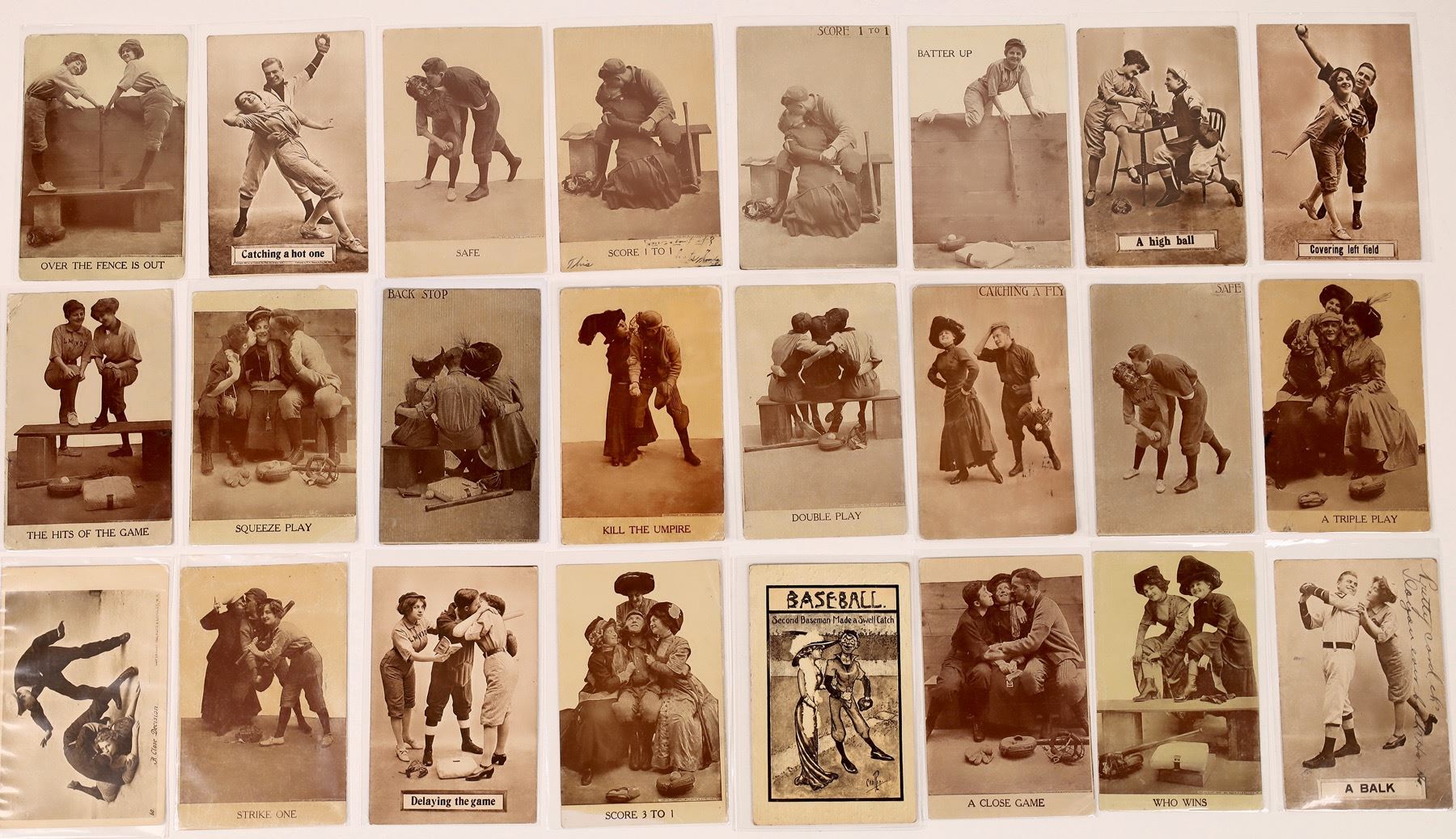 Group of 24 baseball themed postcards with bawdy humor sayings as well as poses. While not as racy as today's media and standards. These are RPC's and pretty clear and sharp, considering their age. These are highly collectable and unique. Please see photos for more detail and condition.