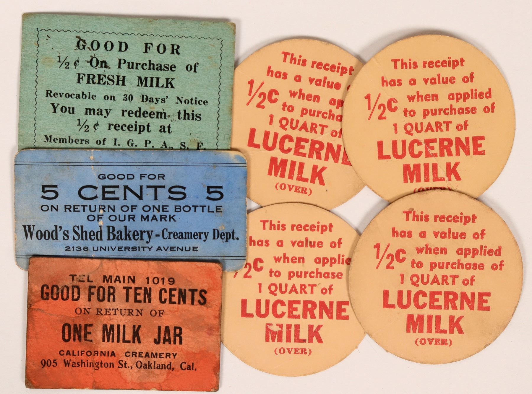 Lot of seven cardboard tokens from Alameda/Contra Costa creameries: four from Safeway Stores, GF 1/2 c on Lucerne Milk; GF 10c on return of one milk jar, California Creamery, Oakland; GF 5c Wood's Shed Bakery-Creamery, University Avenue, Berkeley; GF 1/2c Fresh Milk, Clay Market, S.F. Ex: Ron Lerch Collection.