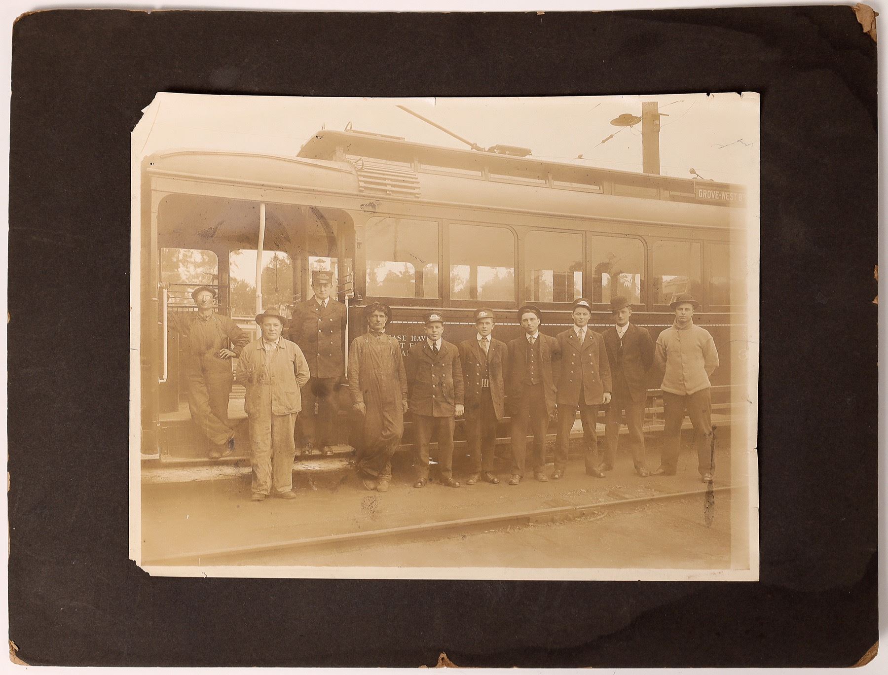 Mounted antique photograph of a Bay Area streetcar. There is a group of ten men standing in front of the streetcar who appear to be conductors and engineers. The conductors have badges on their hats. There is a placard on the train that says "Grove-West 8th." Good condition overall, some small tears around the edges of the photograph. Photo is 10 x 7.75, overall size is 13.75 x 10.75 inches.