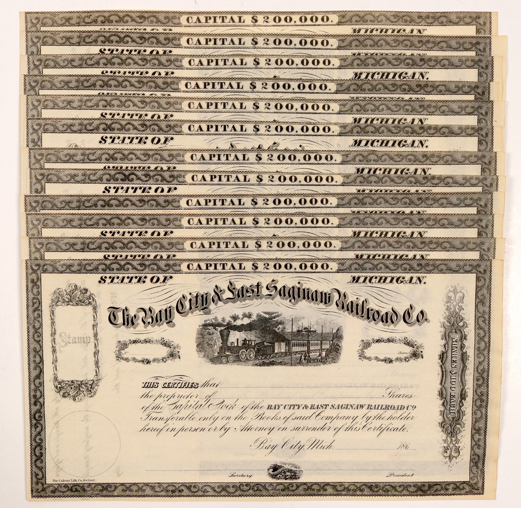 12 unissued stock certificates for Bay City & East Saginaw Railroad Co. Vignette of railroad with ship in background. Printed: The Calvert Lith Co., Detroit. Bay City and East Saginaw Railroad a defunct railroad that operated in central Michigan. Bought by the Flint and Pere Marquette Railroad. Chartered on April 8, 1864. Nov. 1, 1867 completed a 13-mile railway line from East Saginaw, Michigan to Bay City. In 1868 the F&PM line leased by F&PM. Bought out right in 1872. (Wikipedia)