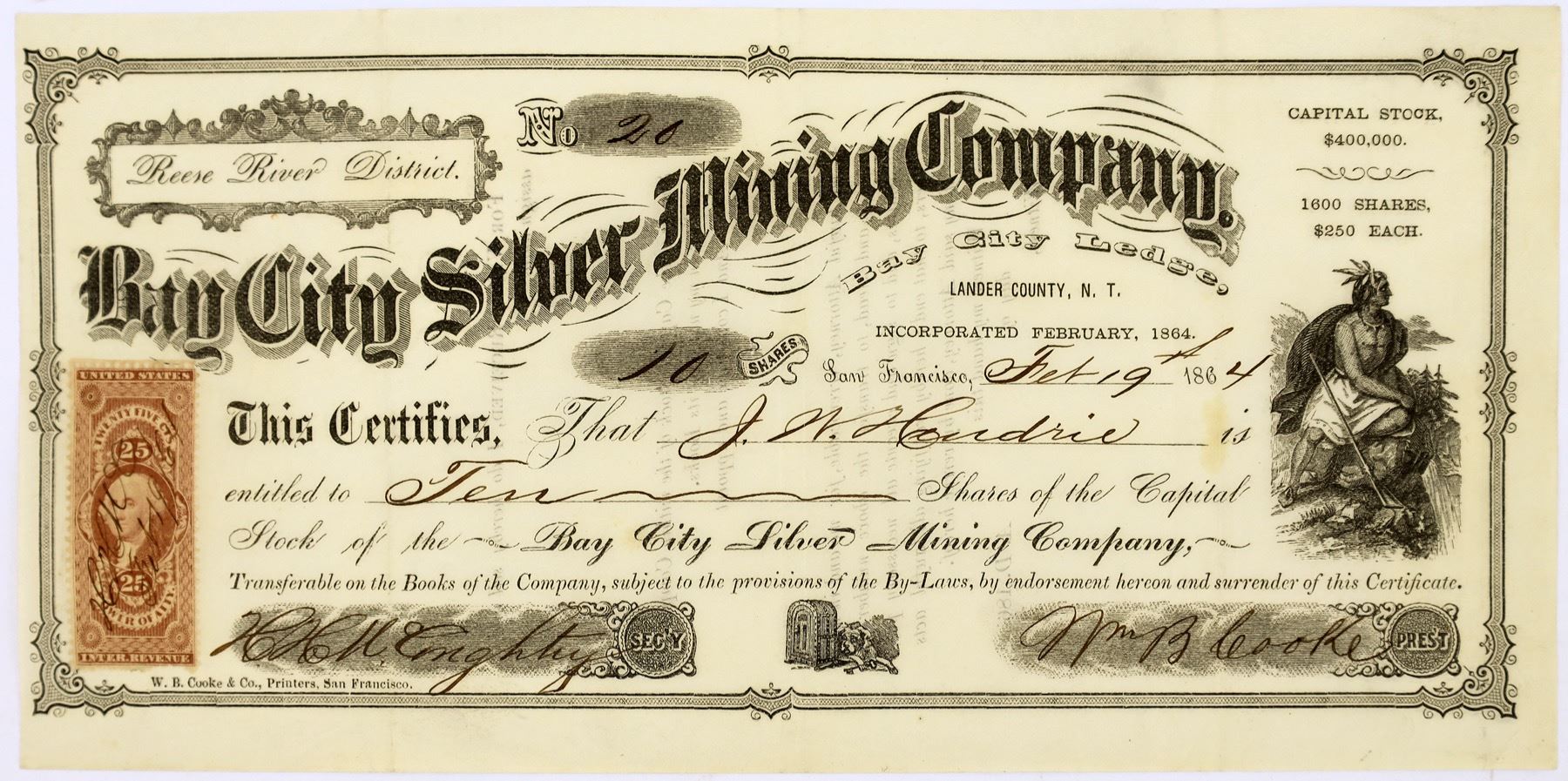 # 20 for 10 shares to J. W. Hendrie (San Francisco clothier). Signed by H. H. Conghtey(?) and William B. Cooke as president. Dateline San Francisco 1864. Incorporated February 1864. Shares worth $250. Location Bay City Ledge, Reese River district, Lander County N. T. Not cancelled. 25c Power of Att'y revenue stamp. Printer W. B. Cooke of San Francisco. (Perhaps Mr. Cooke just couldn't resist anymore and bought one of his own Comstock mines.) Cooke published lettersheets, an 1854 volume on Joaquin Murieta, etc. He started his lithography business in San Francisco in 1850. No edge, corner, pinhole or discoloration issues.