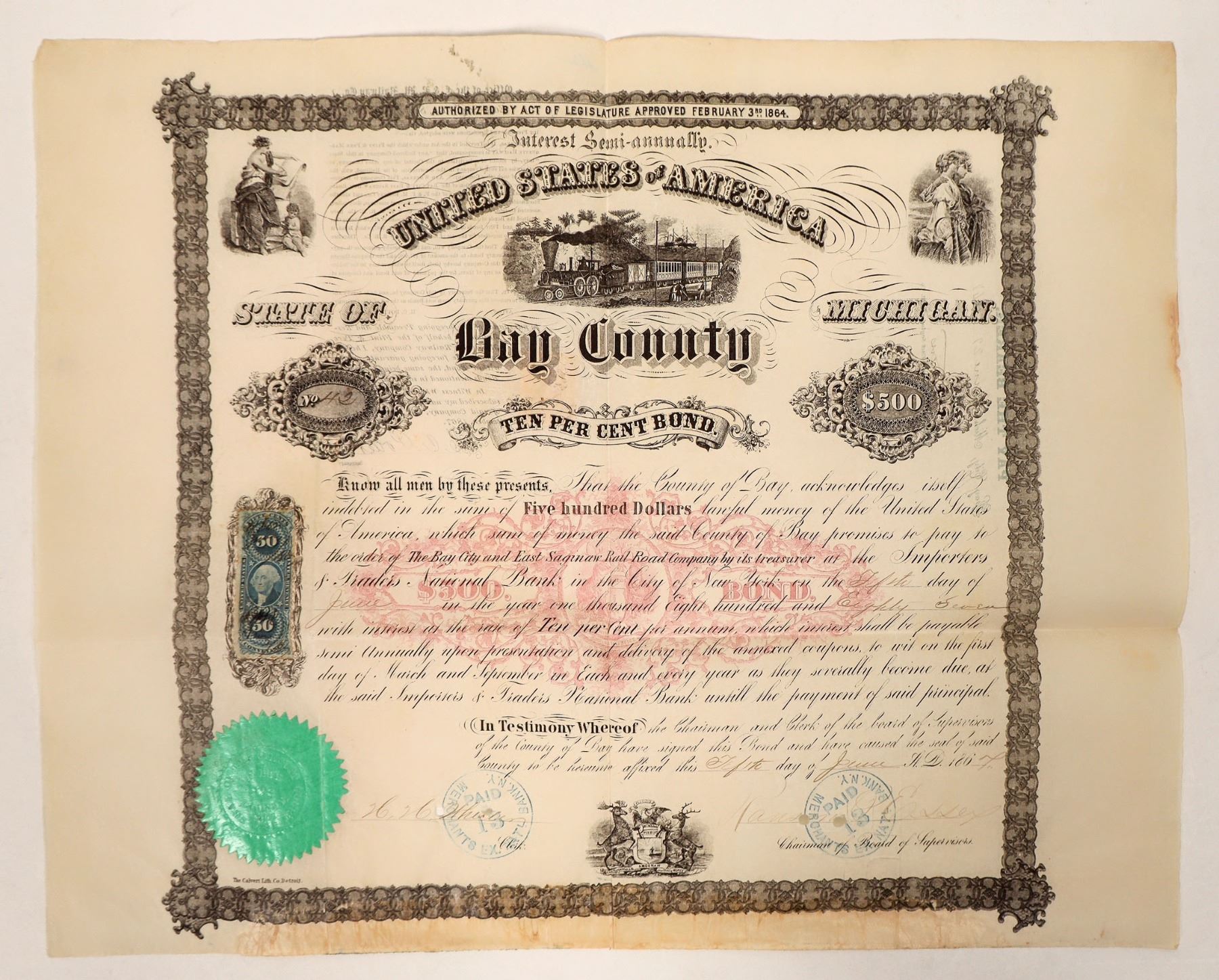 Issued Bay county bond, 1867. No coupons, some bottom adhesive residue. Please inspect.