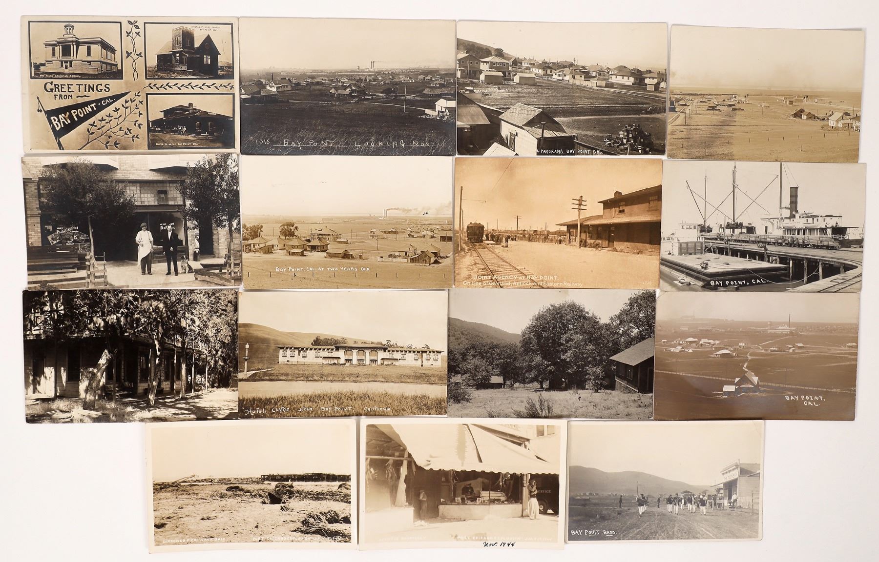 15 choice Bay Point RPC's with excellent contrast. Early cards, c. 1909-11. Dock, Navy pier, train depot, band, Hotel Clyde, Old Clayton Hotel etc. California Bay Point