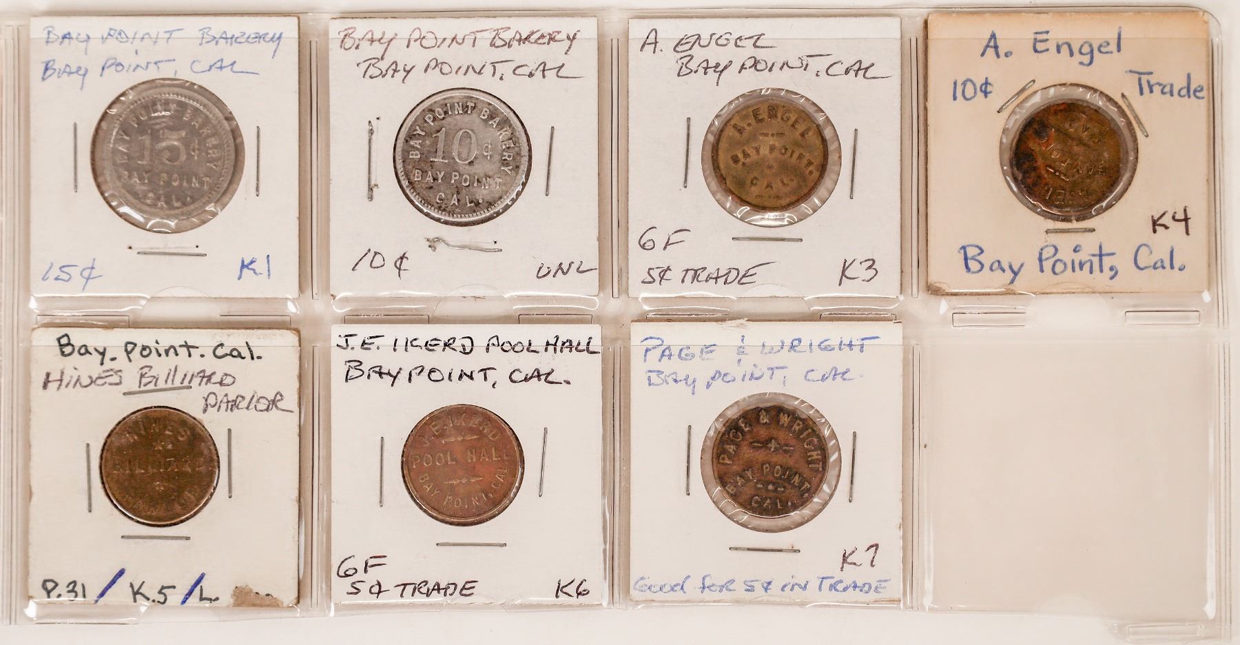 7 Bay Point tokens. K1-7, only missing K8. Bay Point Bakery 10c and 15c. A Engel 5c and 10 c. Hines Billiard parlor 5c, J E Ikerd Pool Hall 5c, Page & Wright 5c. Bay Point California