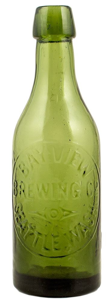 Bay View Brewing Company, Seattle Washington. "Not To Be Sold" on back side. Pint, bright green applied top beer bottle. Thought to be extremely rare, a choice and desirable bottle. Bright and vibrant. Minor inside lip bruise at right.