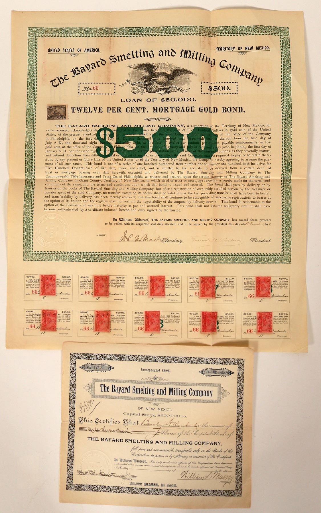 1) Stock # `93 for 100 shares to Barclay A Warbucks. Signed by president William D Murray and George S (?). Dateline Central City 189-. Incorporated 1896. Dog ear upper right. other nicks and small rips. 2) $500 Mortgage Gold Bond. Cancelled September 2, 1903 on date it was due. Large corner folds. Some discoloration upper right. 10 coupons with 2c document stamps for payment made. 50c document stamp on bond. 15.5x18". "The Bayard portion of the Central Mining District includes the towns of Bayard, Central, and Vanadium. The San Jose Mine produced gold, silver and copper before 1869. The adjoining Groundhog and Lucky Bill claims were located in 1900. In 1928 the American Smelting and Refining Company (ASARCO) took over both mines and operated them as a unit, the Groundhog Mine. After World War II, the mine operated sporadically. In 1969 production resumed until 1978 when it was closed. The Owl Mine was a small operation that operated until 1905." from mininghistoryassociation.org. Ken Prag Collection