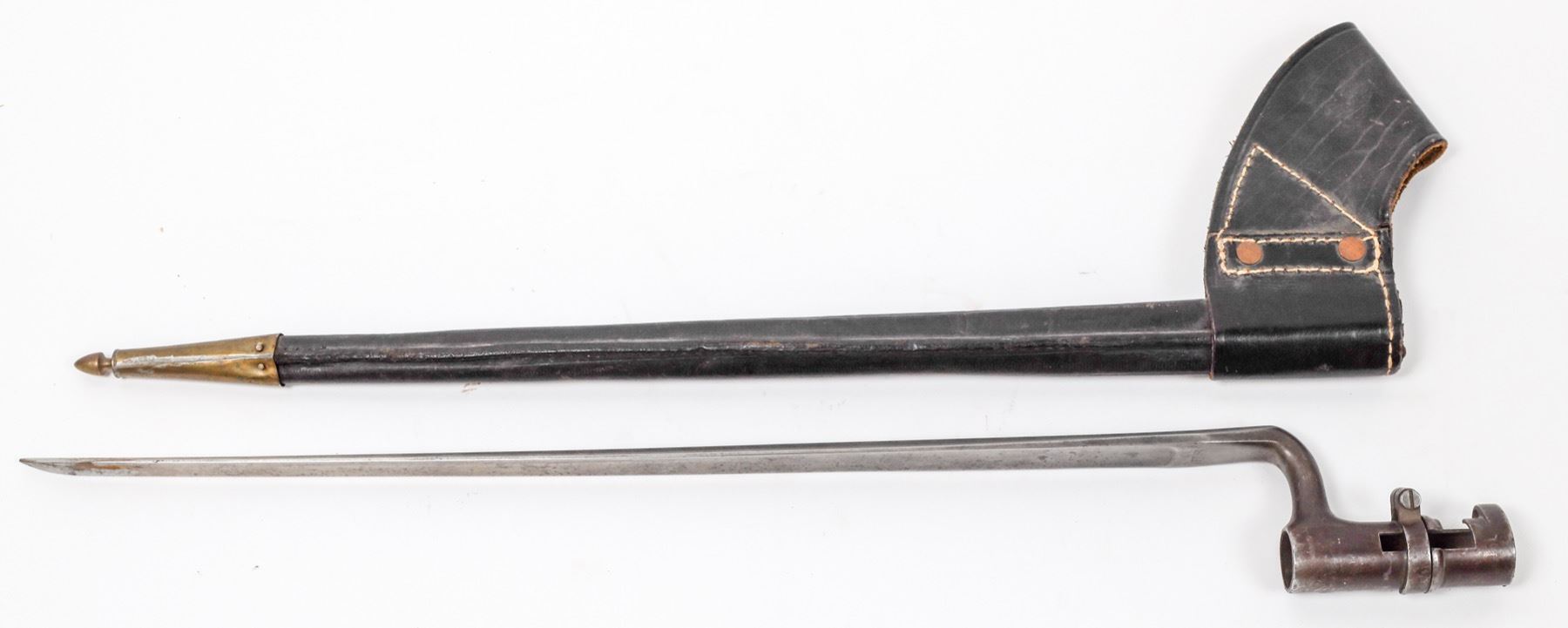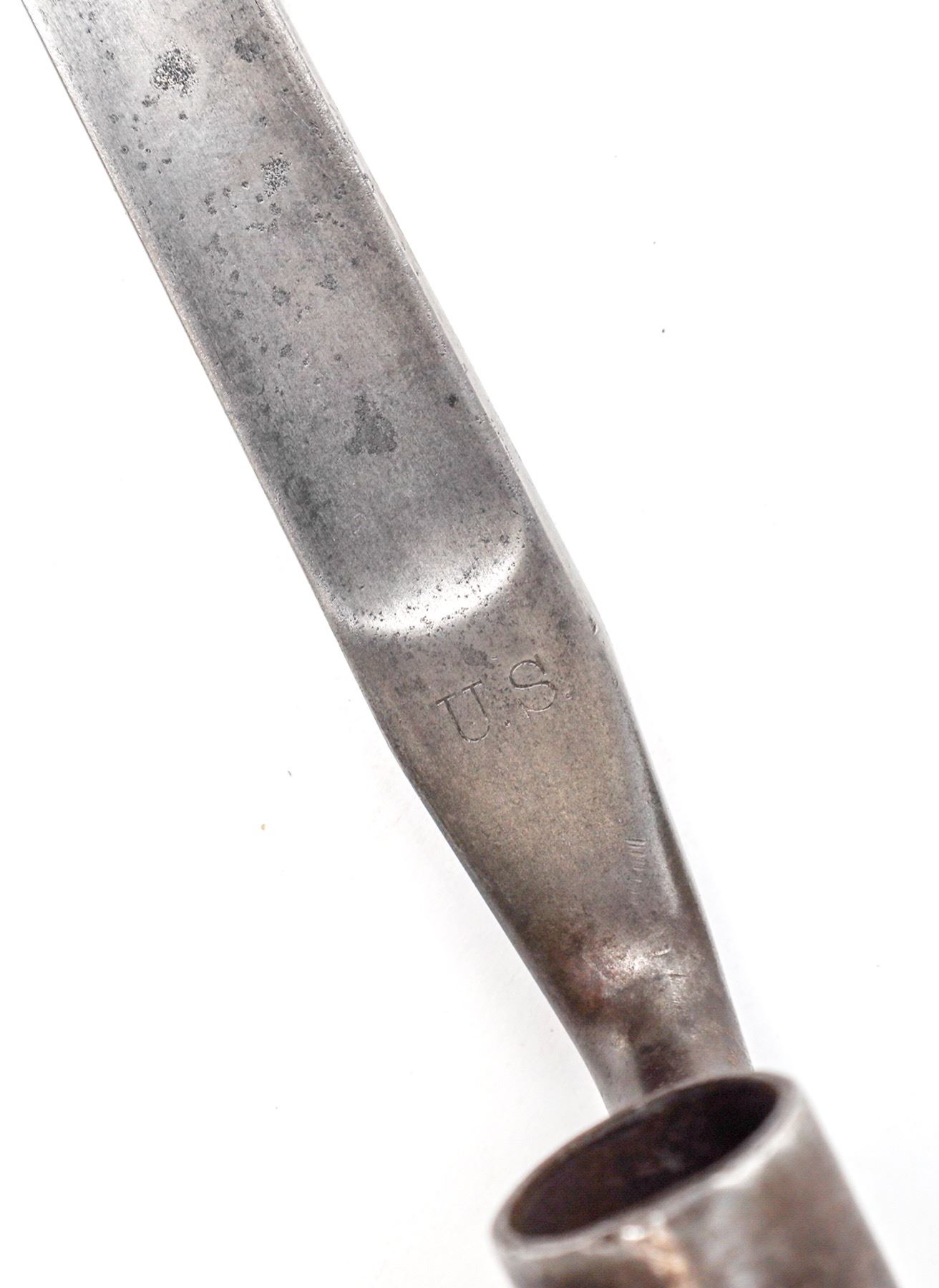 This bayonet is a Springfield rifle model 1855/1863 complete with scabbard and frog. 22 in. overall length. The familiar triangle shaped blade with U.S. stamped in the ricasso area. The shank has the L shaped cutaway with a collar and screw against a cast collar on the shank. Good condition with some patination.