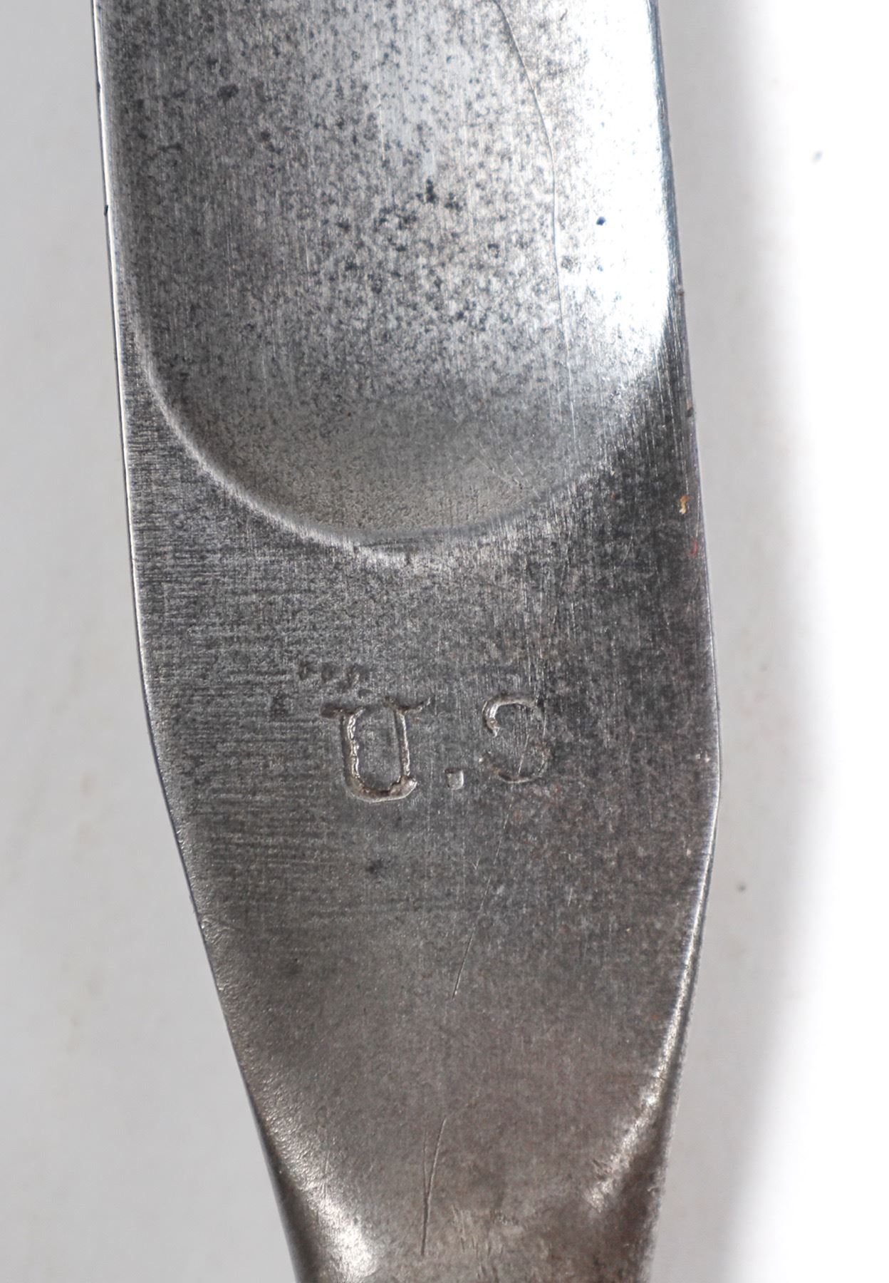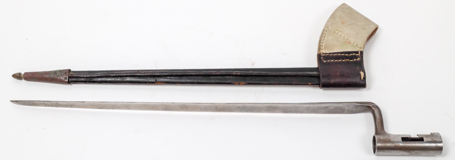 This bayonet fits the Model 1816 U.S. contract musket. It is recognized by the L-shaped mortise and without a set collar. This was specified for the Springfield Armory as well as Harper's Ferry Armory model and later to outside contractors. 21 in. overall length "U.S." at the ricasso area. Complete with scabbard. The bayonet is in excellent condition, scabbard in good condition with replacement frog attachment. (ref. United States Martial Flintlocks, Reilly, p. 250.)