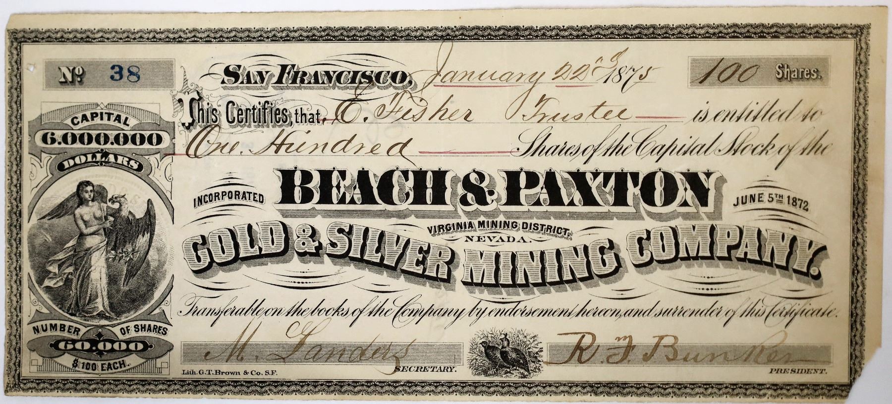 Virginia Mining District, Nevada (printed under title). Inc. June 5th, 1872. No. 38, issued for 100 shares to E. Fisher on Jan. 22nd, 1875 in San Francisco. Signed by president R. Bunker and secretary M. Landers. Not cancelled. Black border and print. Two vignettes: allegorical woman with phoenix (left) and small vignette of two birds (bottom). Lith. G. T. Brown & Co., SF (noted African-American lithographer). The Beach & Paxton was next to the Con Virginia on the west. It made appearances in regional newspapers in 1864, 1872, and 1875, but never showed success. Although the Annual Mining Review and Stock Ledger [1876, pg. 38] called it very promising. Notes on Grafton T. Brown and examples of his work are included. Also notes on the Beach & Paxton.