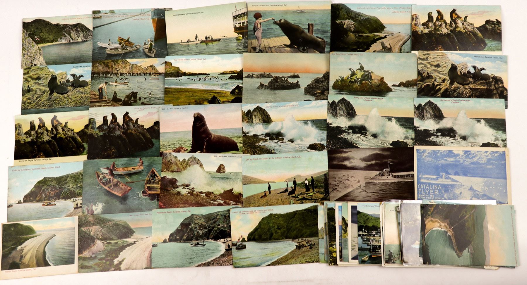 Lot of 50+. Twenty postmarked 1907-20 : Avalon, Long Beach, SAn Pedro, L.A. A few birdeye views, mostly street level: seal rocks and the et seal Ol’Ben, glass bottoms boats and people looking through bottom, searchlight trip, Pebble and Moonstne beaches, some storm activity. A Rieder Post Card of Tres Bocas Cave (only one I’ve seen going through hundreds of these), Descanso Canyon