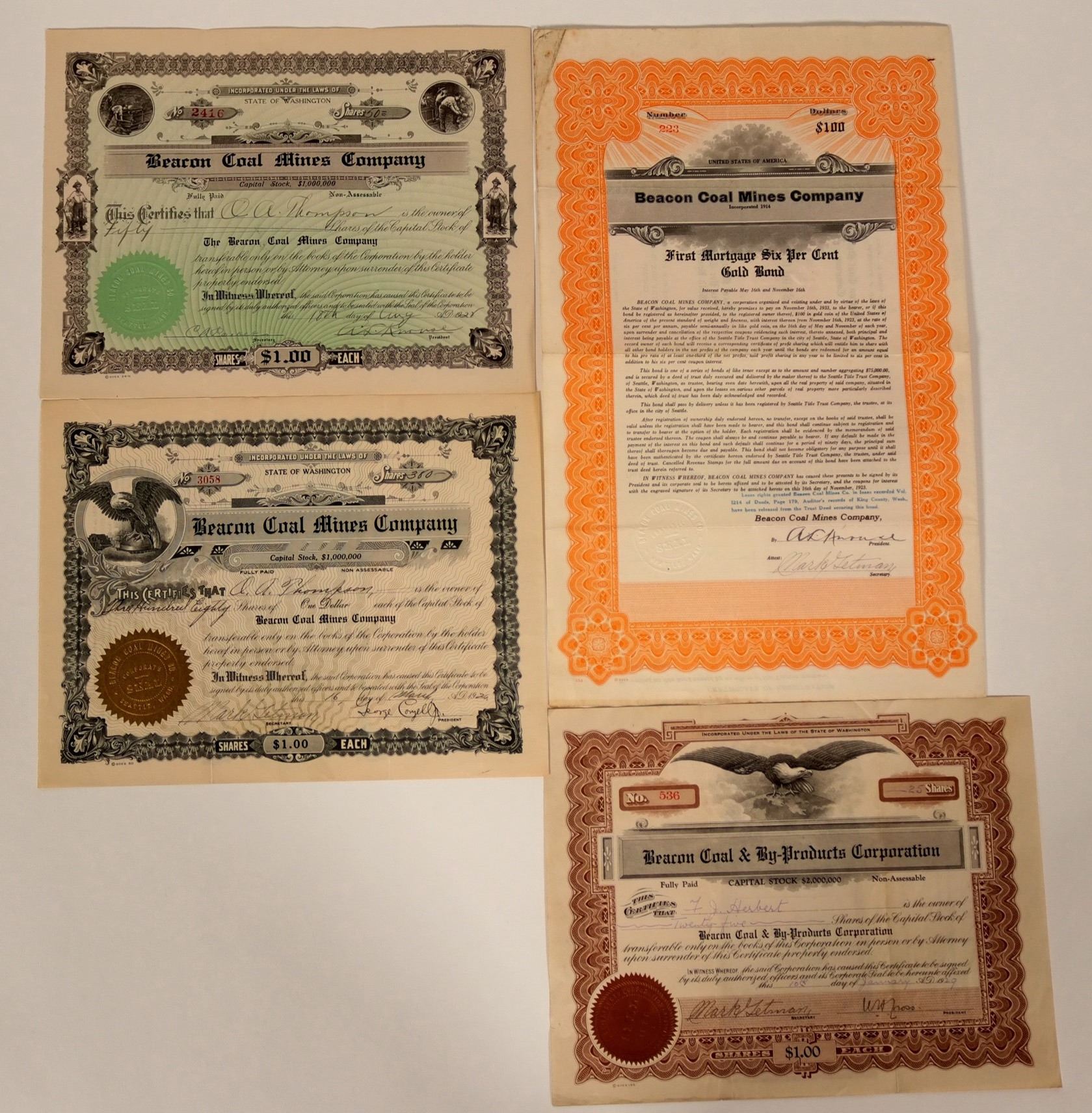 Lot of 4 different. According to a report by Washington (State) Dept. of Labor and Industries, 1922, the company operated at Black River in King County, Washington. This group includes: $100 bond issued in 1923, not cancelled; stock issued in 1926, not cancelled, eagle vignette; stock issued in 1928, not cancelled, multiple mining vignettes; and a stock issued in 1929 ("Beacon Coal & By-Products Corporation"), not cancelled, eagle vignette. Stocks in good condition, bond has most wear. City: King County State: Washington Date: 1923-1929
