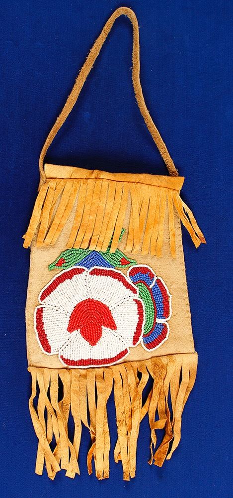 Great little floral motif brown tanned beaded bag with fringe. Looks to be one of the woodland Indian tribes, measures 11”x5 ½”. Est. $40---$60 HWAC# 62032 Date: Location: