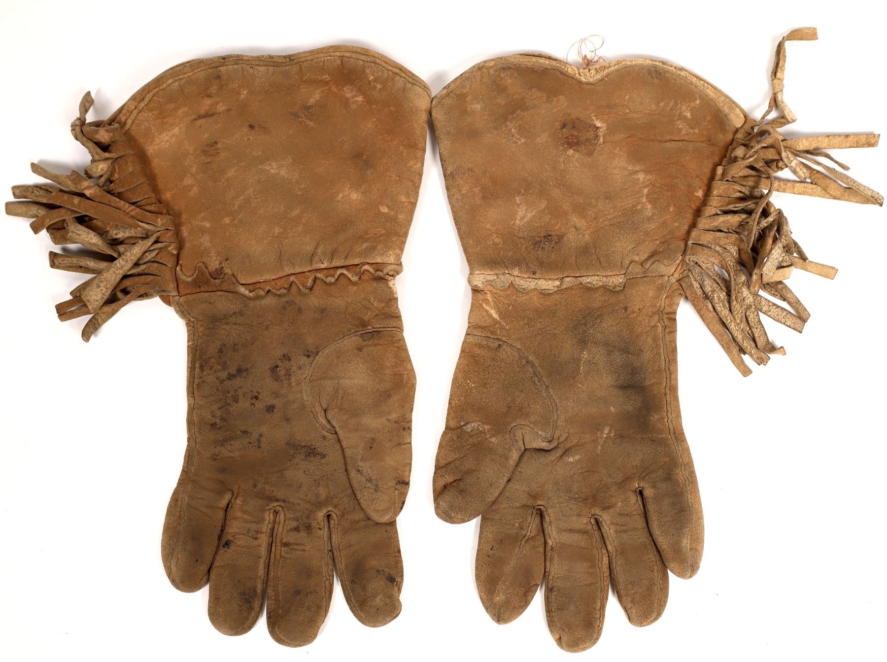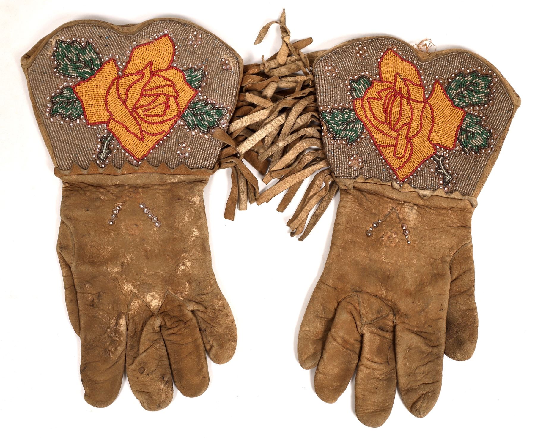 Handsewn, beaded buckskin gauntlets with contour-stitched, bright yellow rose design with green leaves and sequins under the beads that outline the flowers and leaves. Missing a narrow line of beads on the back of the hand from general use. Three-inch long leather fringe. Size large. Possibly NW Plateau tribes (Blackfoot, Flathead). Used but not frayed.