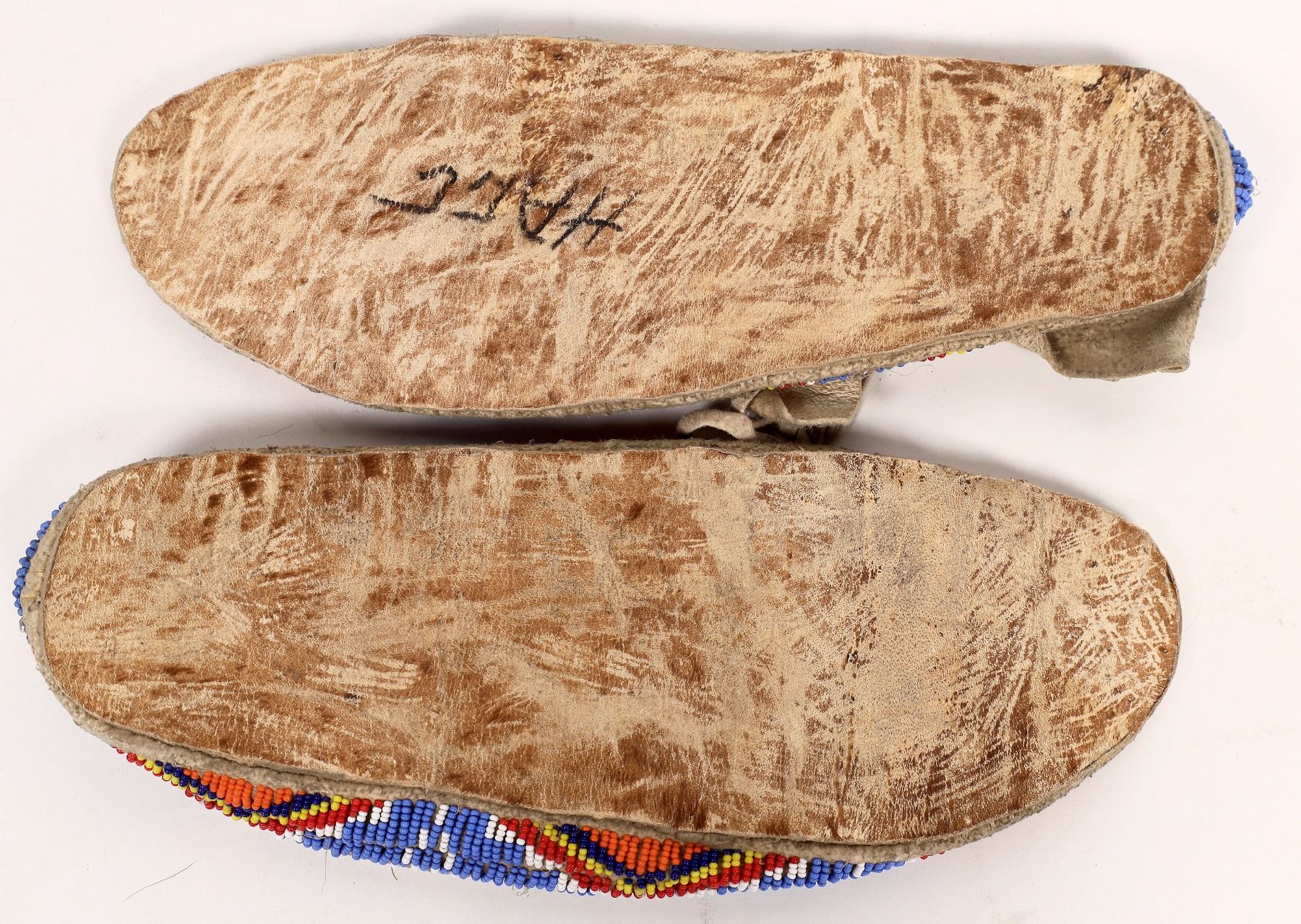 Men's moccasins with Indian-tanned buckskin uppers and rawhide soles. The uppers are covered in lazy stitch style beadwork with red, orange, yellow, white, and dark blue beads in diamond-shaped patterns on a light blue background. These moccasins may have sinew-stitched seams. Possibly Lakota Sioux. 11 x 4.75 inches. Some wear, but otherwise in excellent condition.