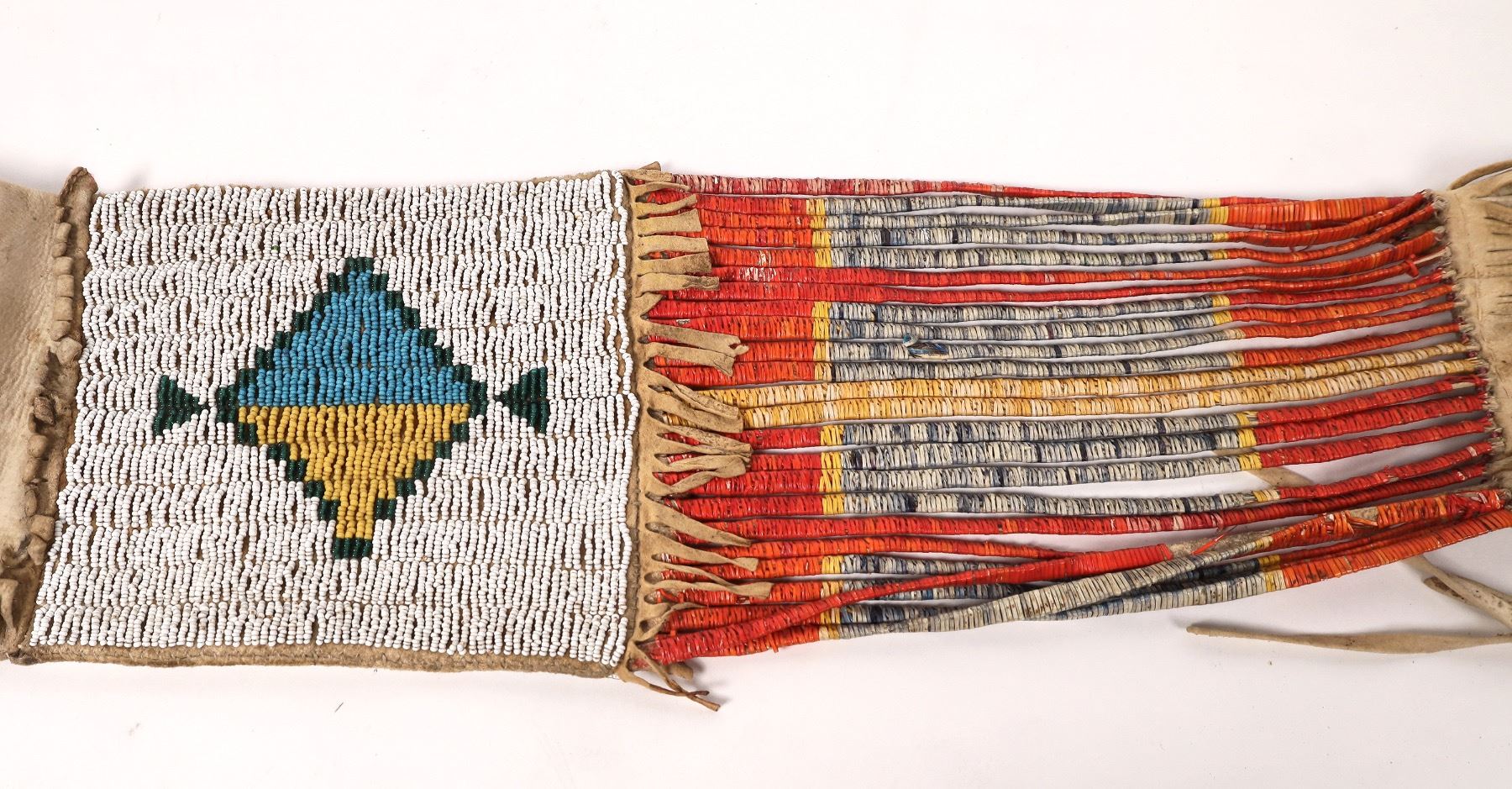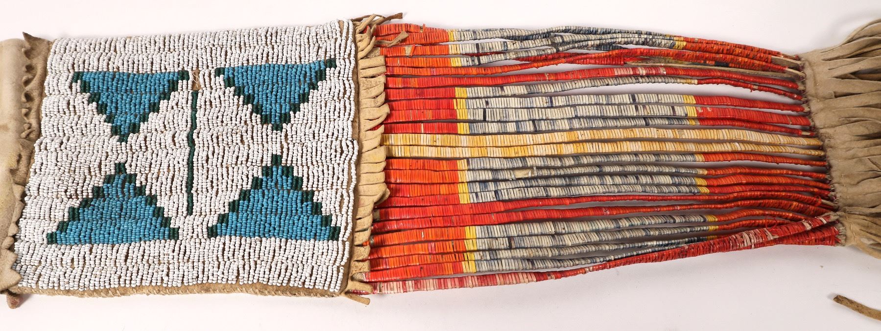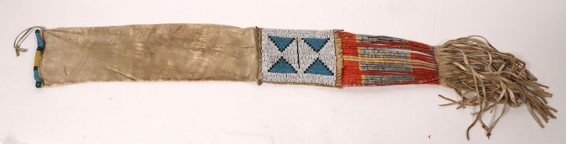 Beaded buckskin pipe bag, 24 inches long plus 17 inches of buckskin fringe. Top 18 inches of the bag is only beaded on the top edge, then it is bare buckskin. The lower six inches of the bag is covered with a lazy-stitched, 12/0, bead design with a white background and dark green, greasy yellow, and turquoise beads, a different pattern on each side. Attached to that end of the bag are eight inches of red, yellow, and grey porcupine quills wrapped around leather fringe tassels, and finally there are nine more inches of unornamented leather fringe. Possibly Sioux. Total dimensions are 41 x 6 inches. Excellent condition with little wear and tear.
