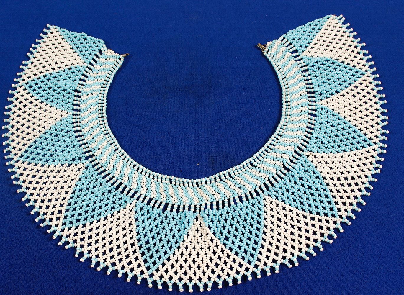 Beautiful blue & white beaded collar neck piece circa early 50’s, in great condition, securing clasp in place. Beaded width is 3 ½ “. Est. $50---$100 HWAC# 62052 Date: Location:
