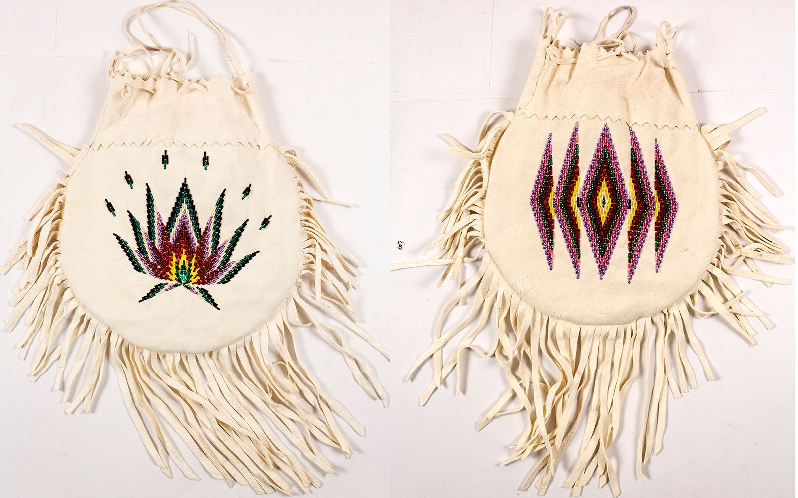 Beautiful new white buckskin handbag by Agnes Kenmille. Beaded on both sides in metallic red, violet, green, white, yellow and black. Bag is lined with a drawstring closure. Fringed sides and bottom. HWAC# 56832 Date: Location: Montana