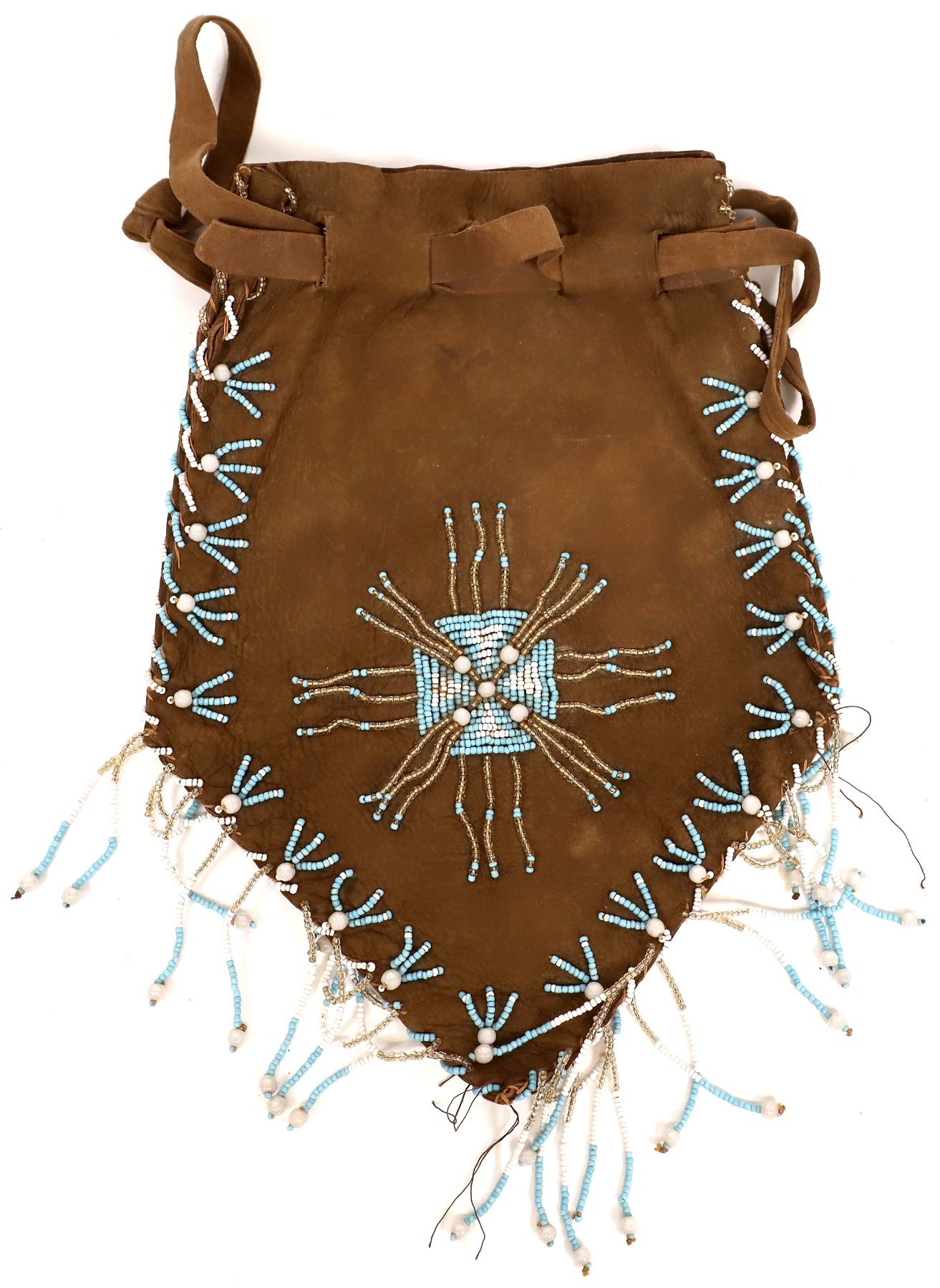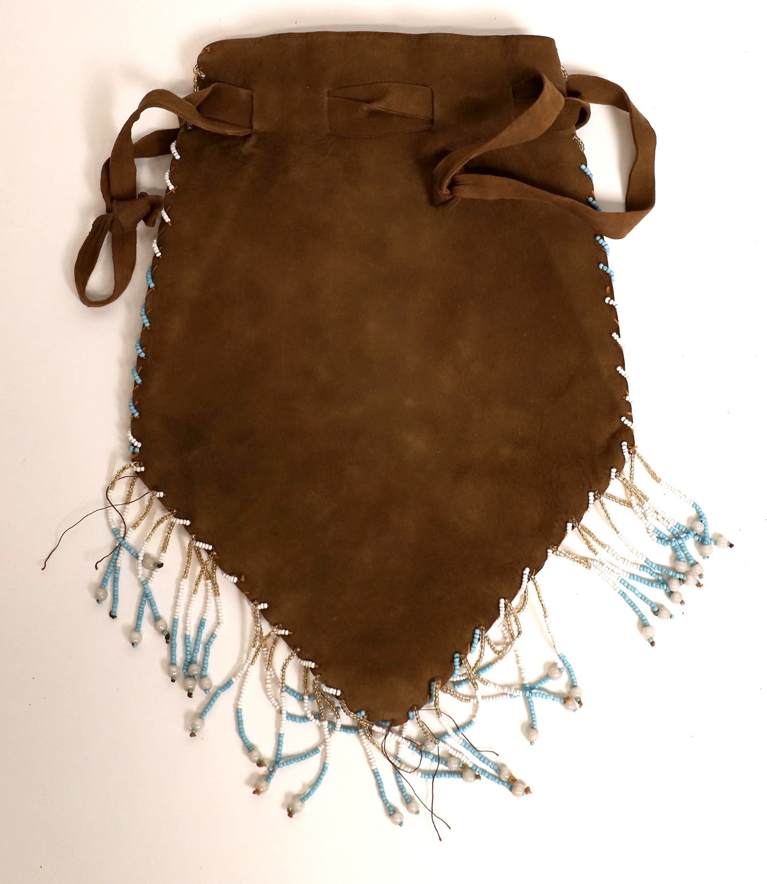Split cowhide leather bag or purse, roughly pentagonal shape, with small plastic pearl ornaments and strings of brown, turquoise, and white beads. 11 inches long, 8 inches wide. Embossed with a // WISCONSIN DELLS // imprint inside. Possibly a souvenir product from that tourist destination.