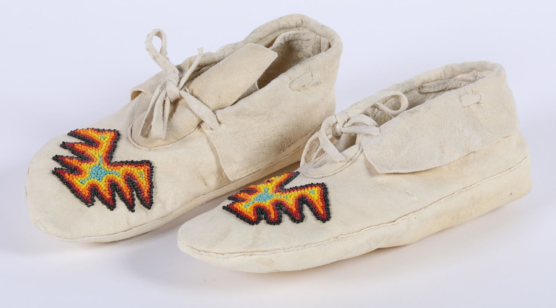 Beautiful unused beaded contemporary moccasins. Approx. size is women's size 7 (9 1/2 in.) , yellow, brown blue beading on top, white buckskin. Bannock or Paiute origin. Attributed to ND.From the Wigwam Collection.