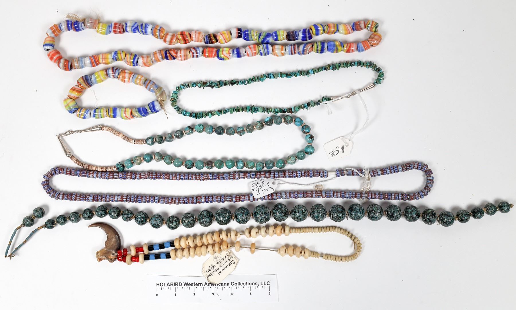 Blue/red, possibly early Russian 31". Yellow/blue/red 8"and 29". Small turquoise 17". Larger turquoise 20". Green 20". Bone trade beads with claw 20".