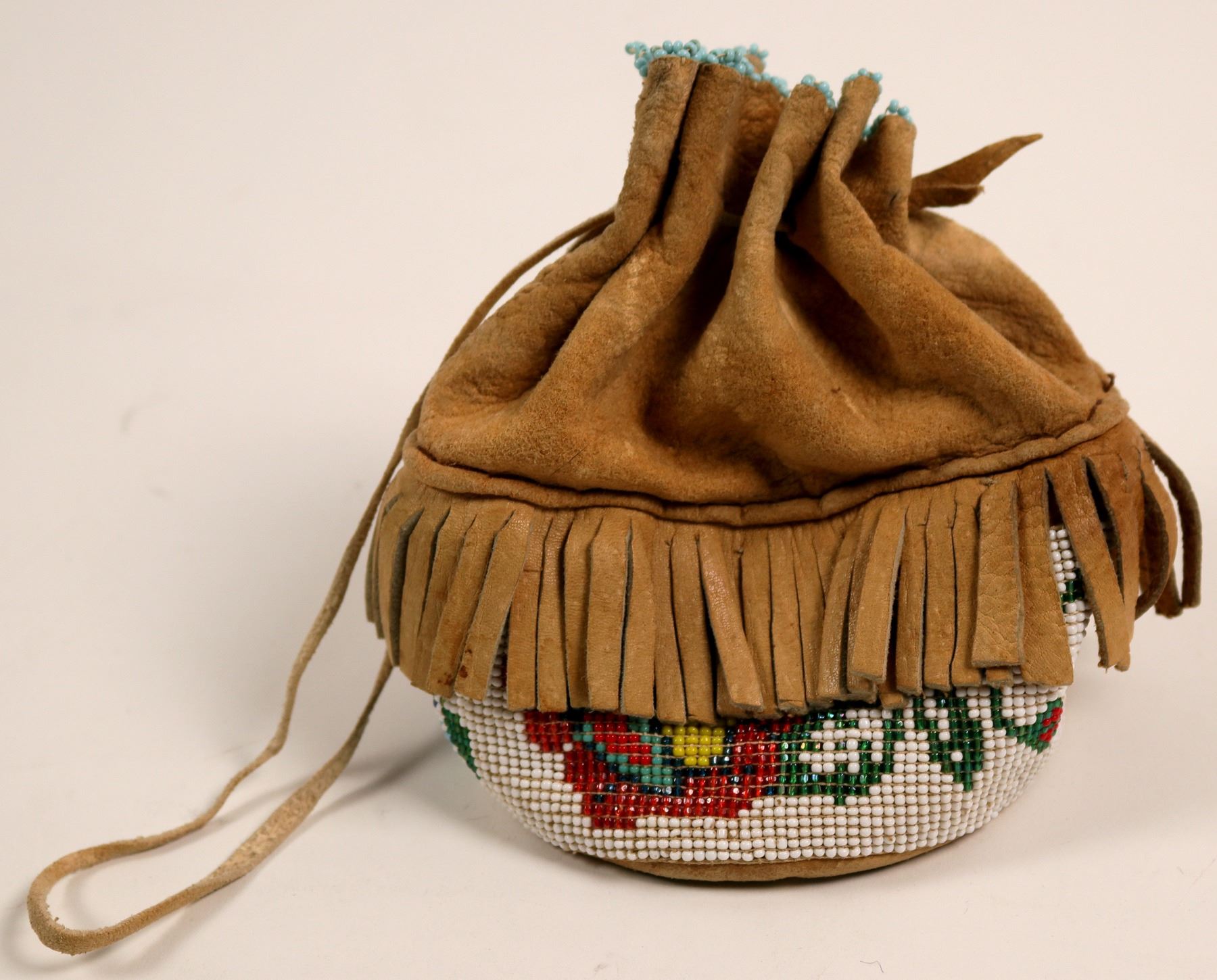 Contemporary small beaded purse made of smoked buckskin. Fringed with drawstring. White & light blue beads are matte with red & dark blue having sparkle. On the inside base of purse appears to be a picture of a horse with a cowboy kneeling with something in his hat. Moe & Mary Royels Wigwam Collection