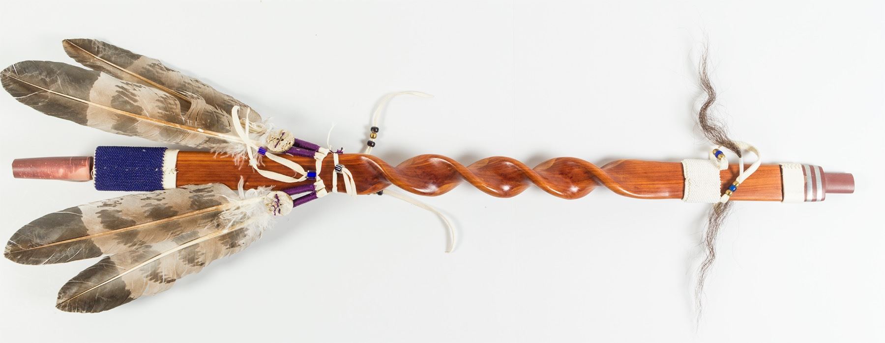 Beaded Smoking Pipe, beautifully turned wood with Catlinite bowl. 35" long. Silver inlay on bowl and stem. New condition. Part of ceramic pipe bowl end broken off. From Kicking Wolf gallery: Smoking pipes, also known as calumets or chanunpa (chanupa), were some of the most prized possessions among almost all Native American tribes. The two most common styles were the larger ceremonial calumet and a smaller personal pipe. Pipe bowls were generally carved from sacred pipestone, also known as Catlinite (named for the artist George Catlin, who spent much time living among and painting the Indians of the northern plains), which is found in only one place in Minnesota. The stone bowls were carved in a wide variety of shapes, such as T-pipes, elbows, and human or animal effigies, and they were often decorated with inlaid designs of lead retrieved from old bullets; today silver is usually used. Native Americans to this day are still making pipes out of stone extracted from these sacred quarries. Pipestems were most often carved from ash or sumac and decorated with eagle feathers, dyed horsehair and porcupine quillwork. Later, after the Europeans introduced beads, beadwork often replaced quillwork. Our pipes are based on several original examples seen in museums and the paintings of George Catlin. They are made from the traditional Catlinite, in most cases inlaid with silver. The pipestems are made from ash and wrapped in braided porcupine quills or beadwork, and further decorated with hand-painted simulated eagle feathers and red dyed horsehair. Each pipe is meticulously handcrafted in the highest quality using only the best original materials available. State: City: Date: ID# 49335