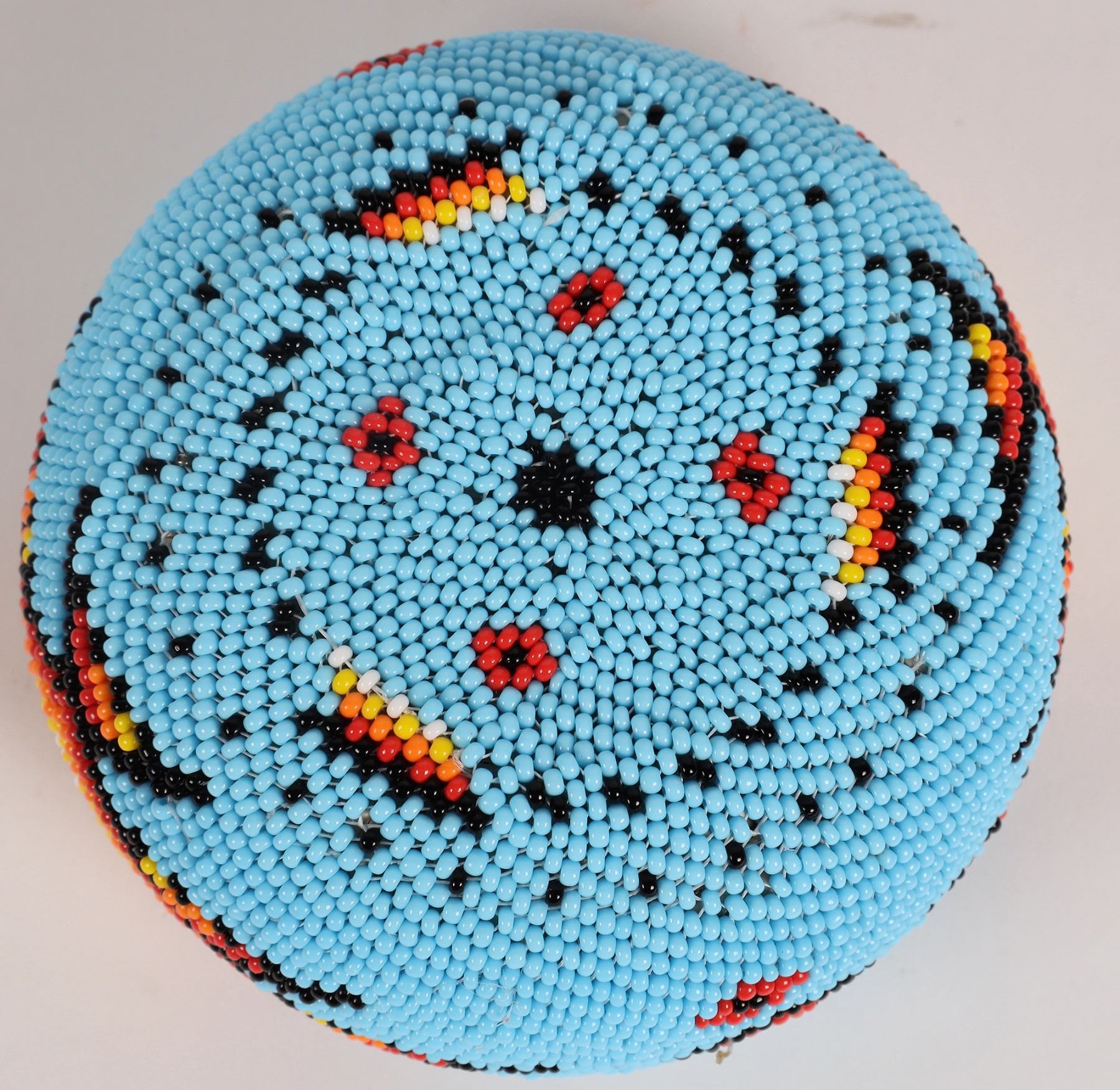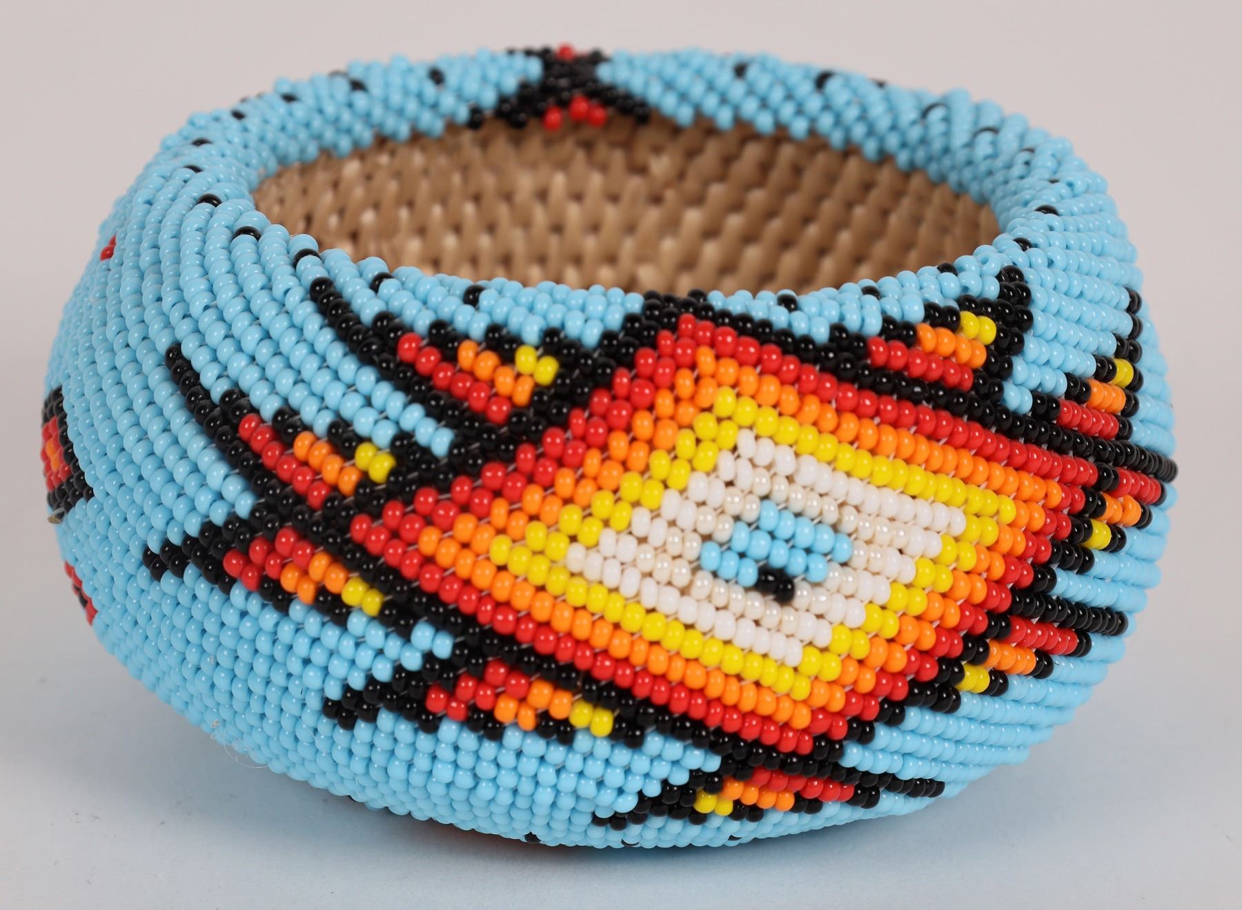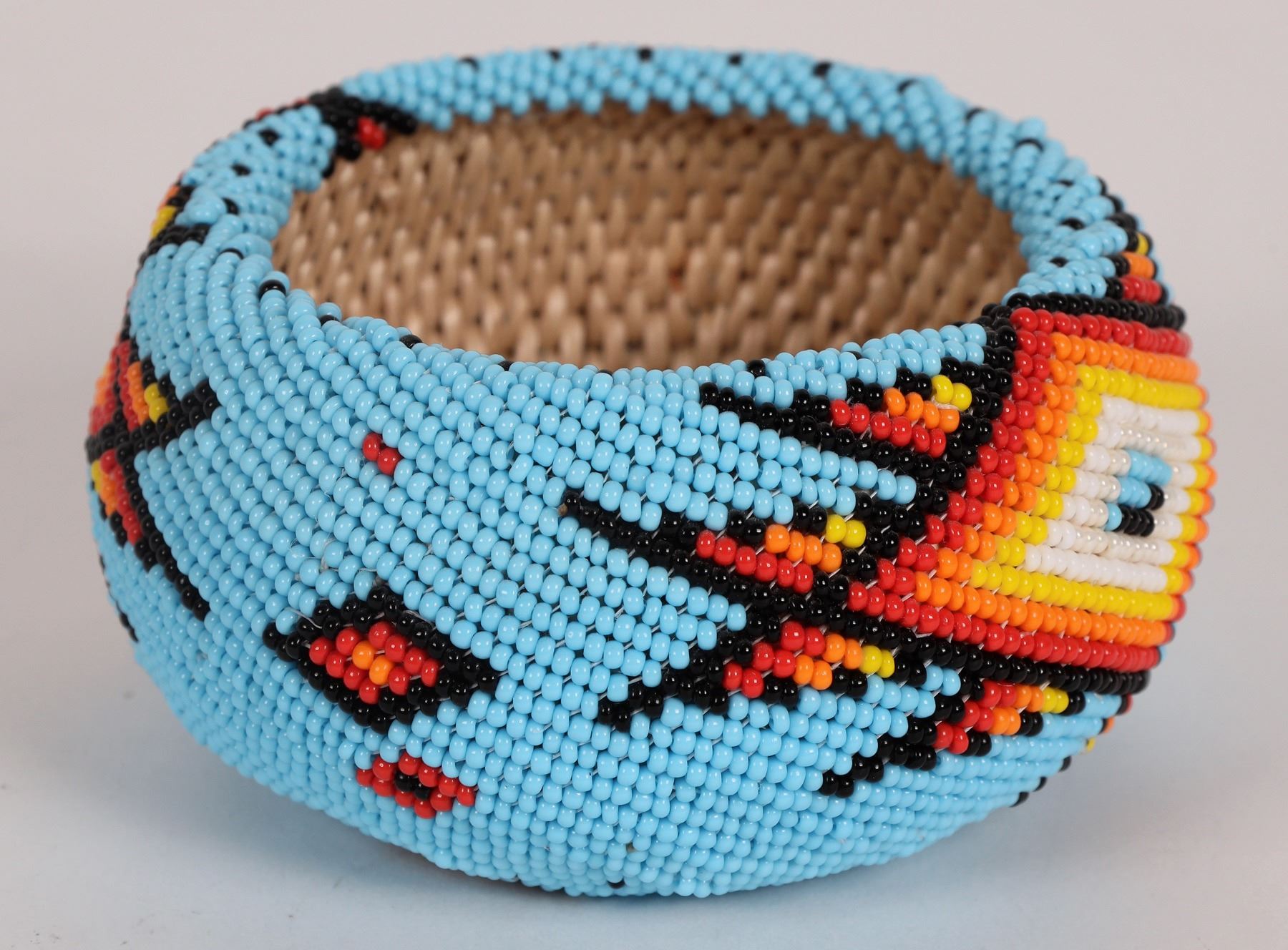 Fully covered beaded Washoe basket, by Ardith Reed. Small willow basket covered with turquoise blue beads, with diamond design on each side in blue, white, yellow, red and black beads. Beautiful detail. 2"x 3.75"