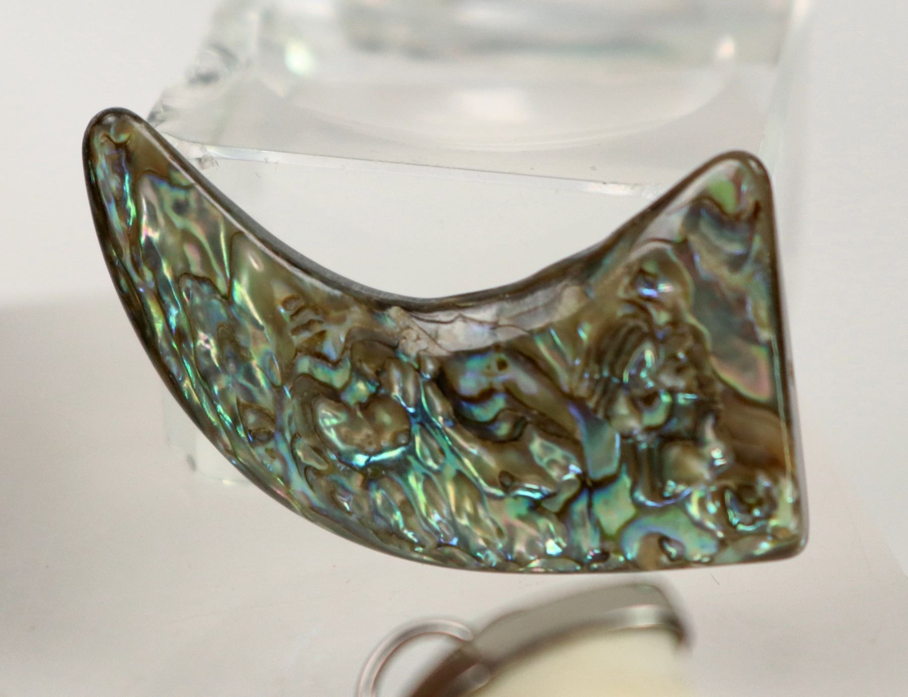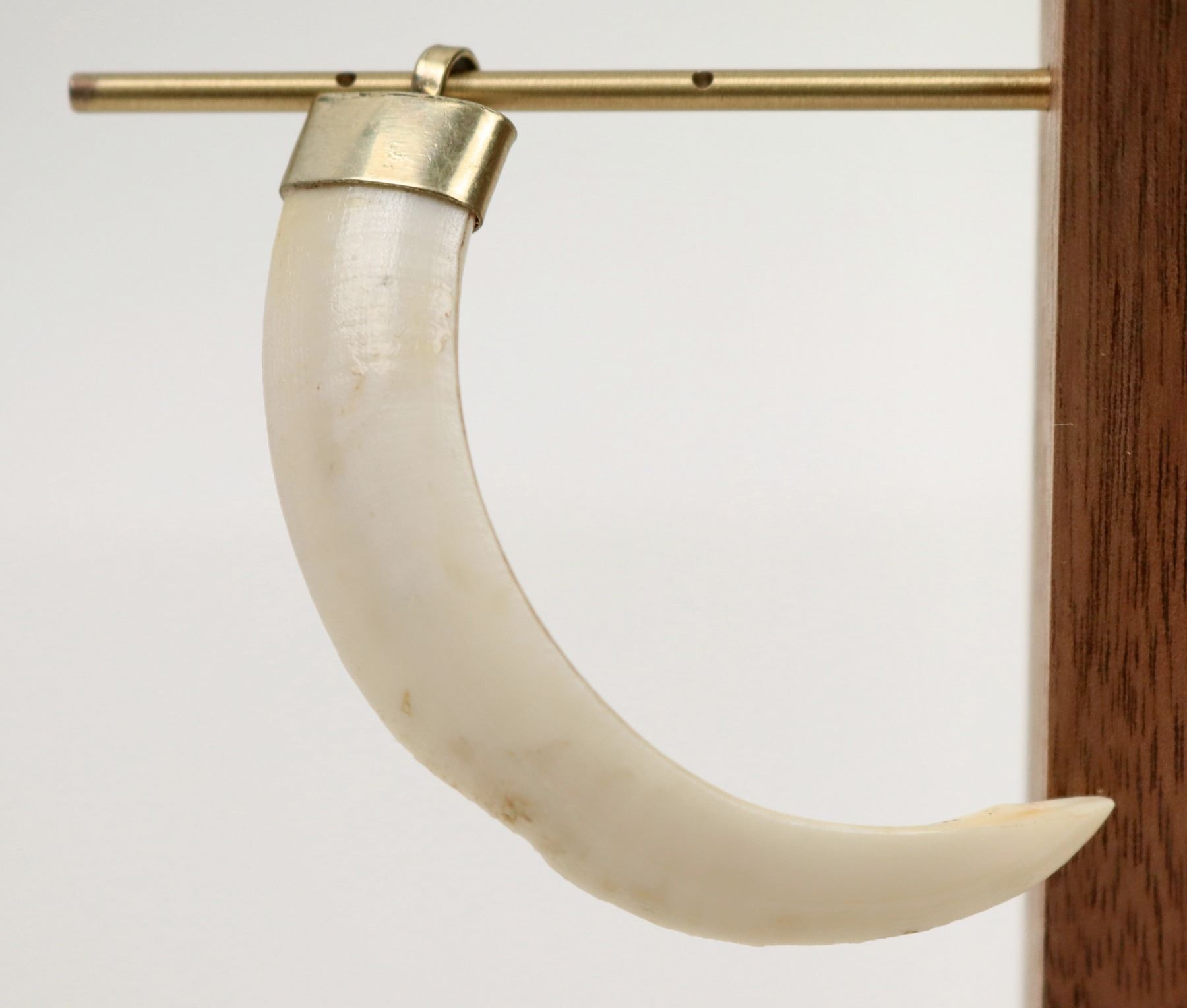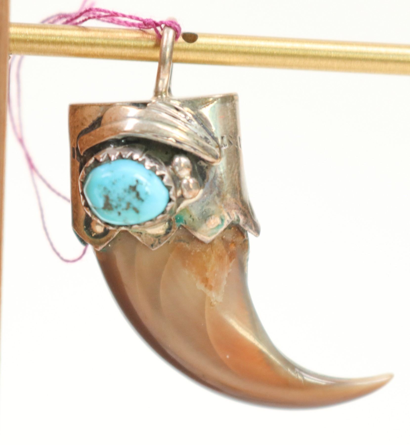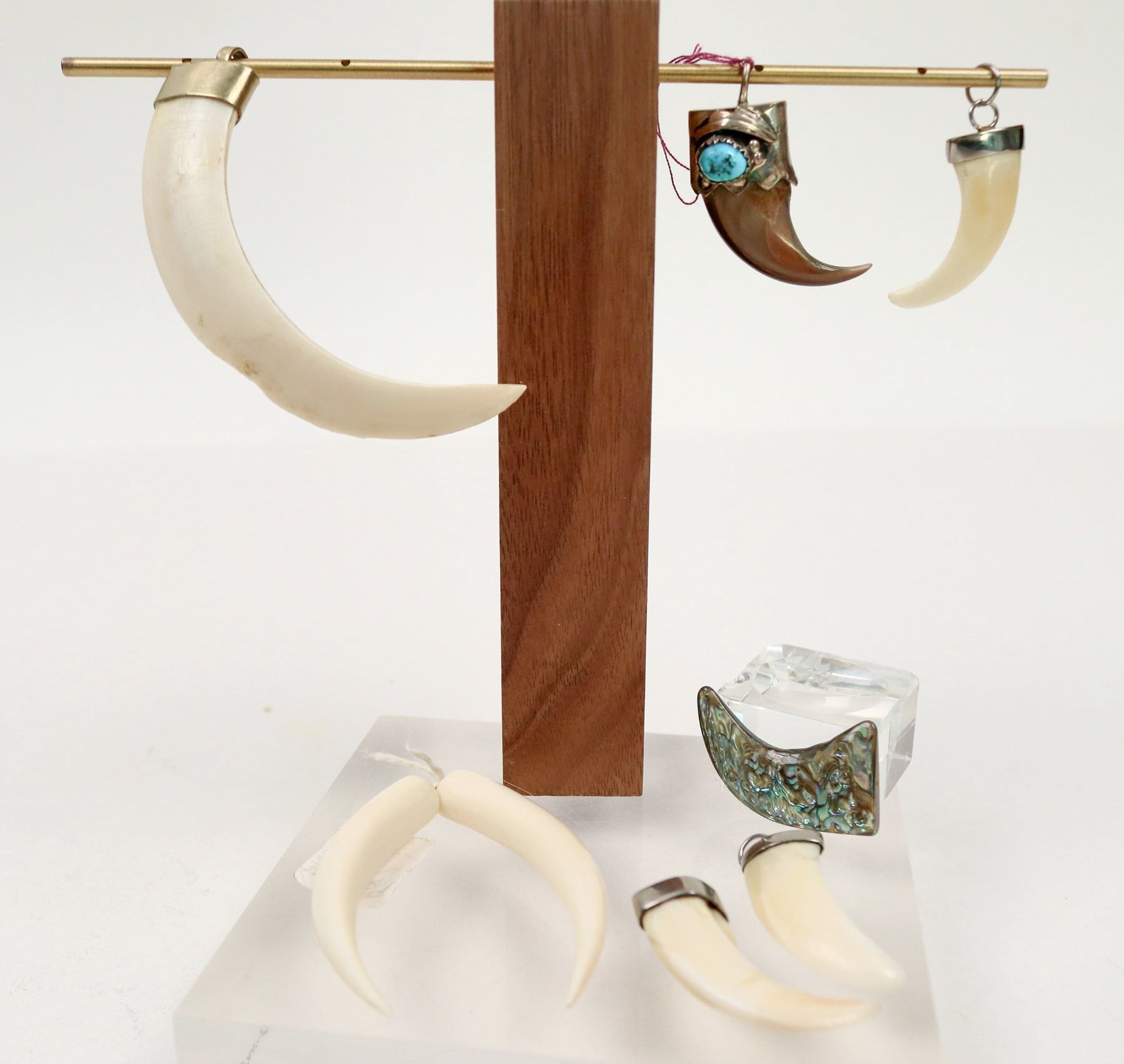 One carved Abalone shell claw shape. One bear claw pendant set in silver cap with turquoise stone. Three wild boar tusks silver cap pendants. One large tusk with silver cap, pendant. two rounded tusks, pendant rings.