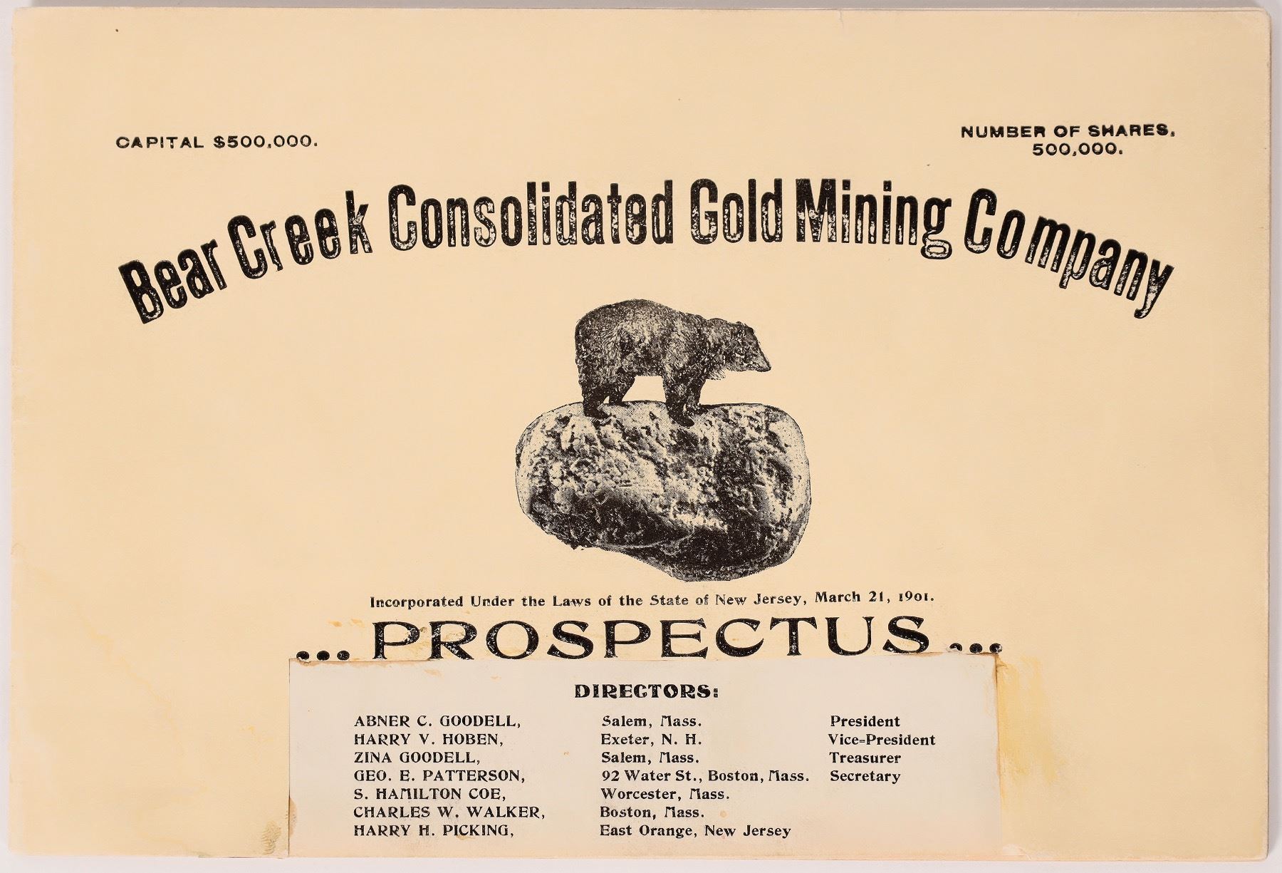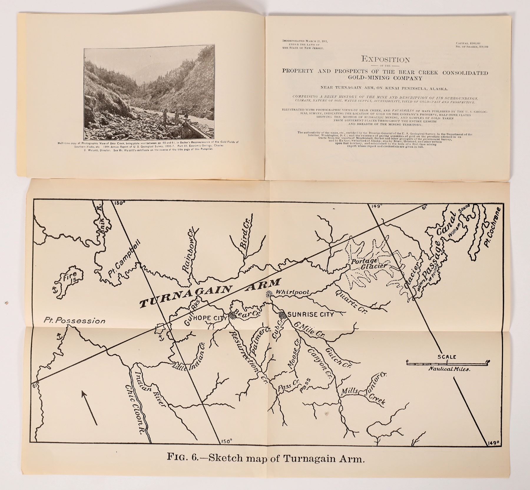 Rare c. 1900's Bear Creek Cons. Gold Mining Co. prospectus. Located near Turnagain Arm on Kenai Peninsula. Includes mine photos, history of the mine area and non attached Turnagain Arm sketch map, 9.5x15". Alaska