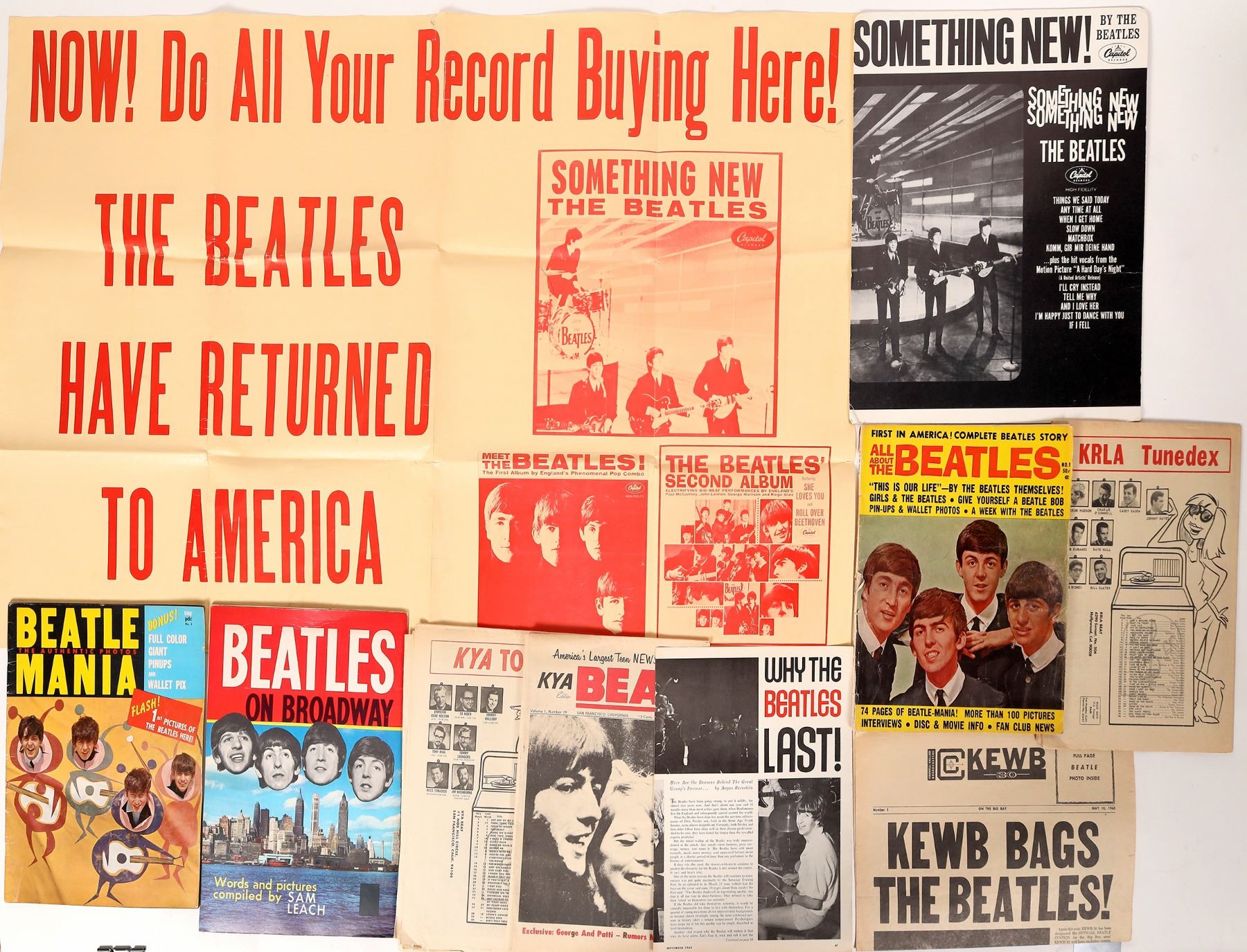 Beatie Mania", Vol.l, No. 1, published by SMP Publ., N.Y., (, 1964 ~ 1st authentic pictures of the Beatles here, 56 pages~ 2) .,.,All about the Beatles", No.I, published by YOPU Press, N.Y., 1964 ~ Complete Beatles Story, 74 pages of Beatie Mania~ 3) '-'Beatles on Broadway", written and compiled by Sam Leach, Whitman Publishing Co., 1964 ~ 4) "KRLA Beat", Los Angeles America's Largest Teen Newspaper ~ 3 issues with articles & photographs (Sept. 18 & Nov. 20, 1965, Feb. 12, 1966) ~ 5) "KEWB/91, S.F. Bay Area Radio Station, newspaper, May 10, 1965. ~ 6) Music Store Browser Box Sign reserved for the Beatles new Capitol Album "Something New" (12" x 14 ½") ~ 7) Large Poster sign for music dealer selling Beatie's merchandise