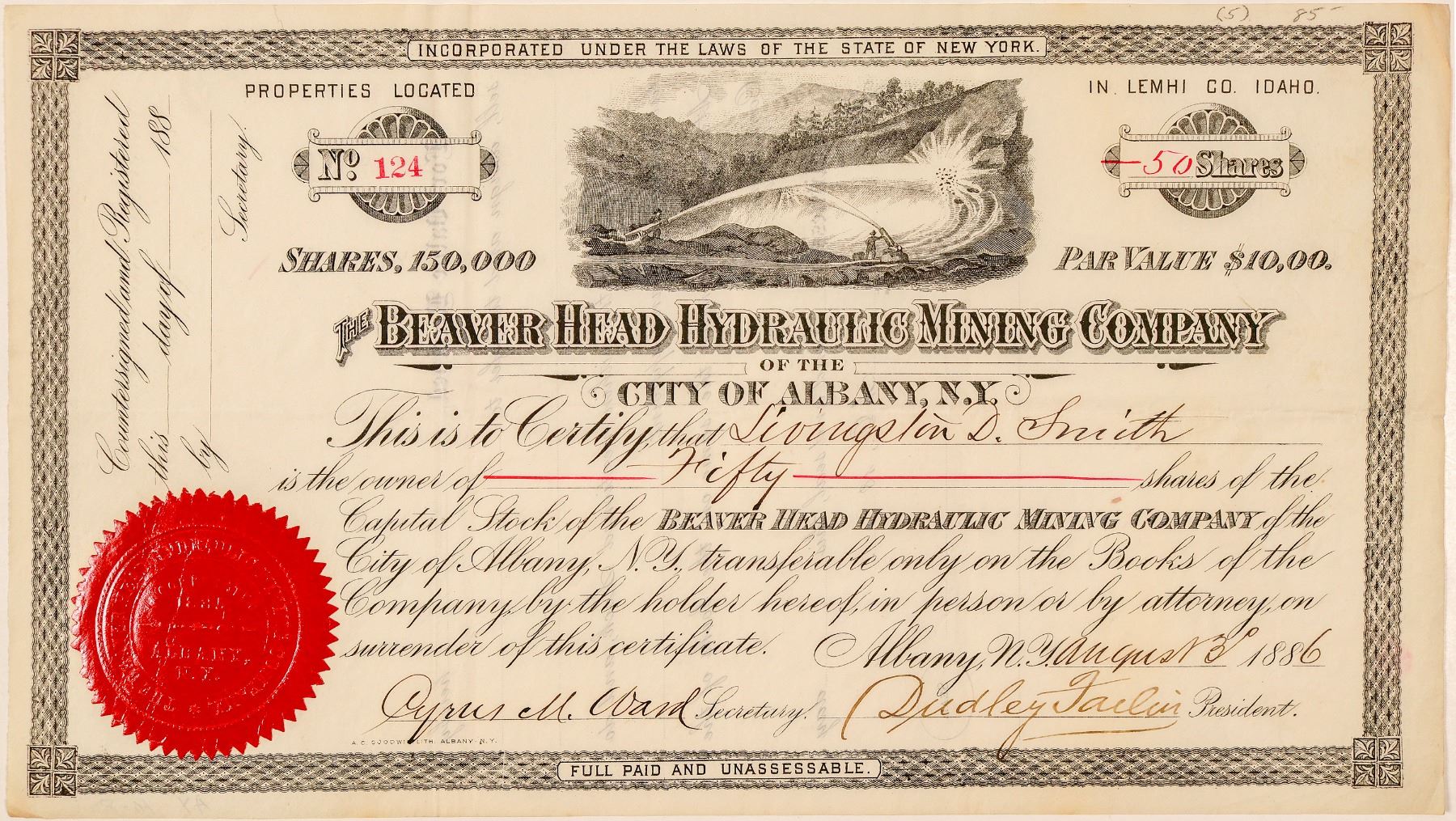 Properties located in Lemhi County, Idaho (printed at top). Great hydraulic mining vignette! Inc. in New York. No. 124, issued for 50 shares to Livingston D. Smith on August 3rd, 1886. Signed by president Dudley Tailin and secretary Cyrus M. Ward. Not cancelled. Black border and print, red seal. Hydraulic mining vignette. Printed by AC Goodwin, NY. 6.75 x 12" Horizontal and vertical folds, bent corners. Ken Prag Collection