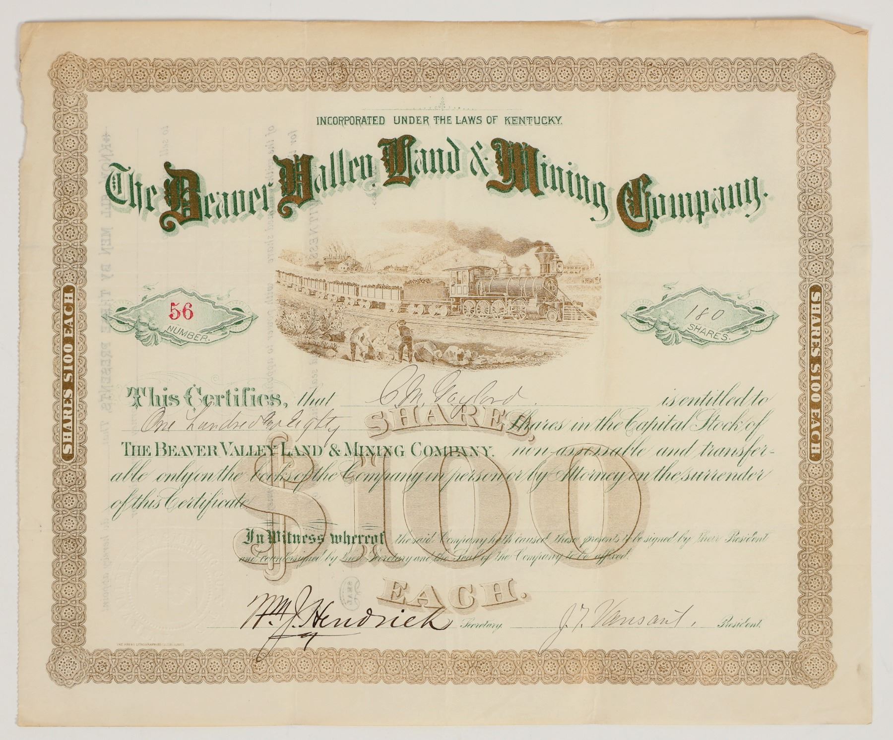 Issued but not dated. c.1880s. Inc. in Kentucky. No. 56, issued for 180 shares to GM Gaylord. Signed by president J. Vansant and secretary Hendrick. Not cancelled. Green and gold print, brown border, and vignette of locomotive. According to our consignor, they controlled 67,000 acres on Beaver Creek in Floyd and Knott Co's, KY.