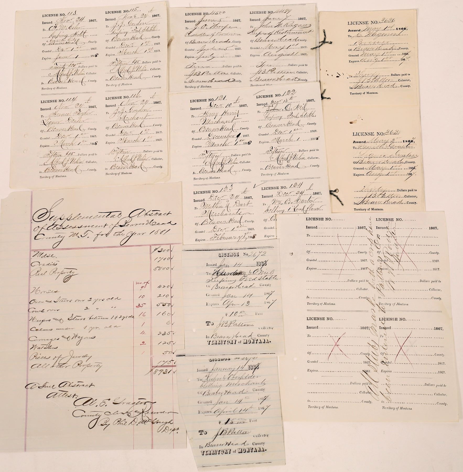 About 40 Territorial Montana licenses from the 1860s. Beaverhead County, Territory of Montana. Each about 4 x 5 inches, handwritten. Also a supplemental abstract of assessment of Beaverhead County, 1881, also hand written. Beaverhead County is the largest county by area in Montana. The county was founded in 1865.