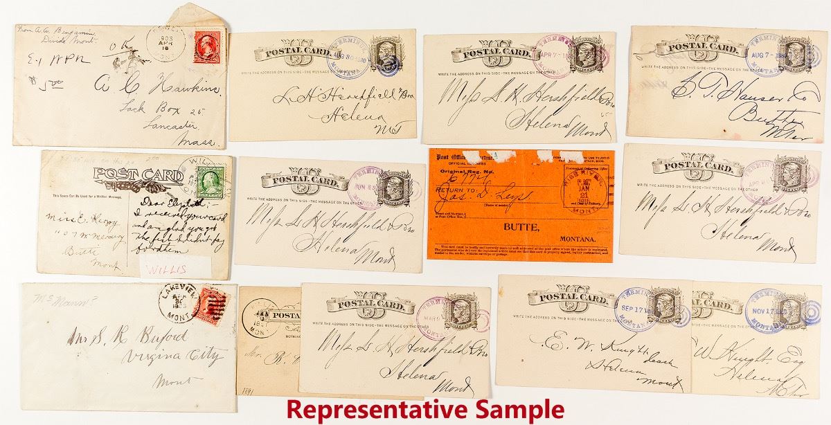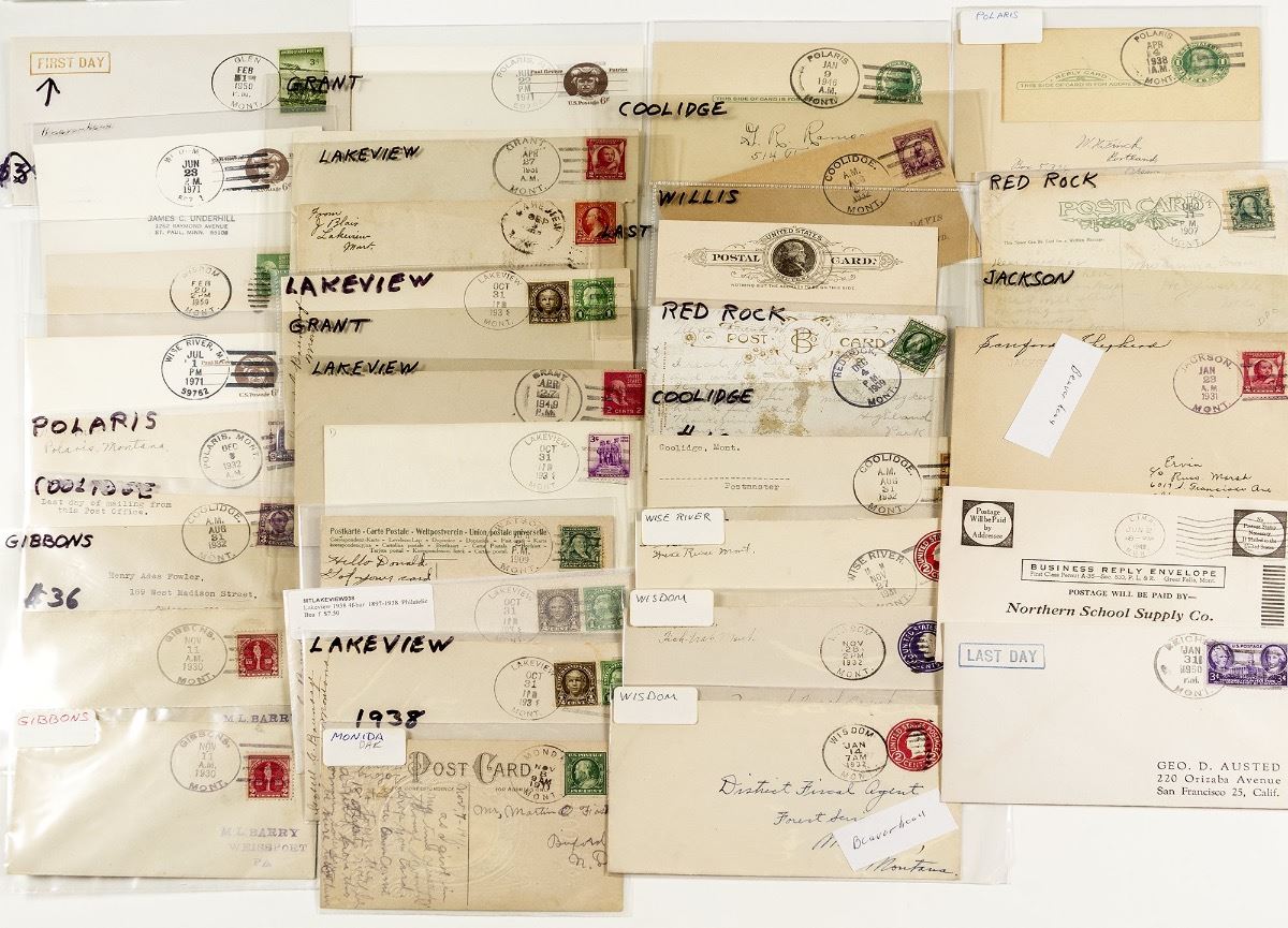 43 Total pieces. Highlights are 8 Terminus territorials with blue and purple cancels, 1903 Dewey (1894-1913), 1915 very early Wise River, 1891 Willis, 1903 early Lakeview. Also includes Beaverhead Last day, Gibbons, Grant, Lima, Watson, Monida, Reichle last day, Wisdom, Jackson, Wise River, Red Rock, Coolidge last days, and Polaris cancels. City: State: Montana Date: Inventory# 38706