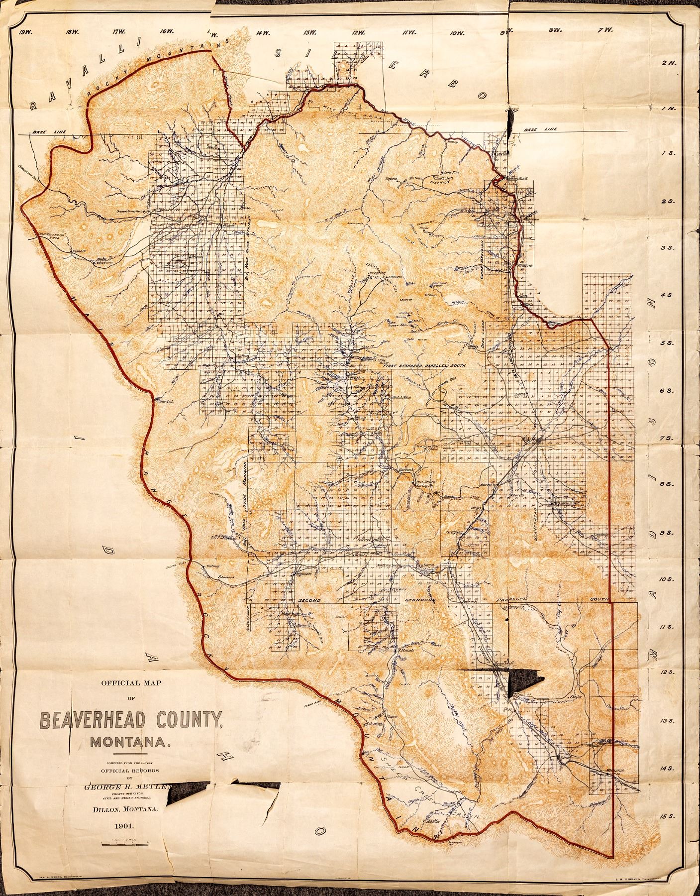 Official Map of Beaverhead County, Montana, compiled from the latest official records by George R. Metlen, county surveyor, civil and mining engineer, Dillon, Montana, 1901. Tears to top edge and elsewhere. 44 x about 55". Needs repairs to tears. very delicate, not canvas mounted. For other Montana maps, please see the mining section in this catalog (Helena Mining District). Numerous document repair tape repairs to tears on reverse.. Suggest canvas mount for tis choice Montana Map that shows shaded relief, mining districts, towns, roads, etc. State:Montana City:Beaverhead County Date: Provenance: Stuart MacKenzie Montana Collection