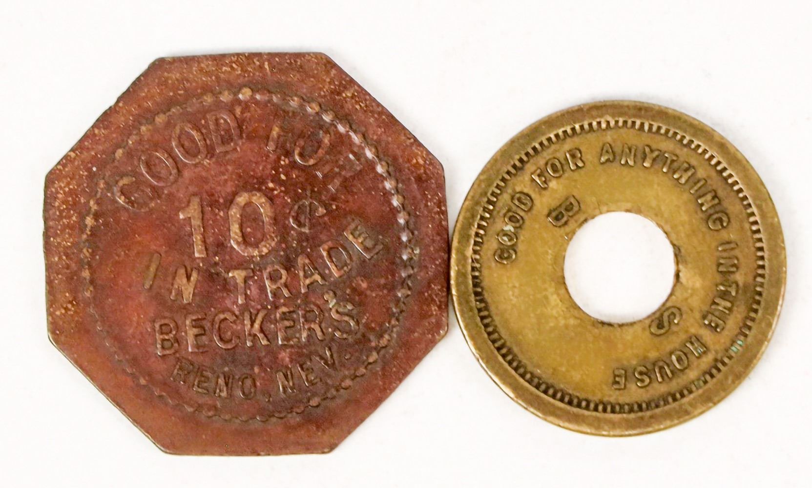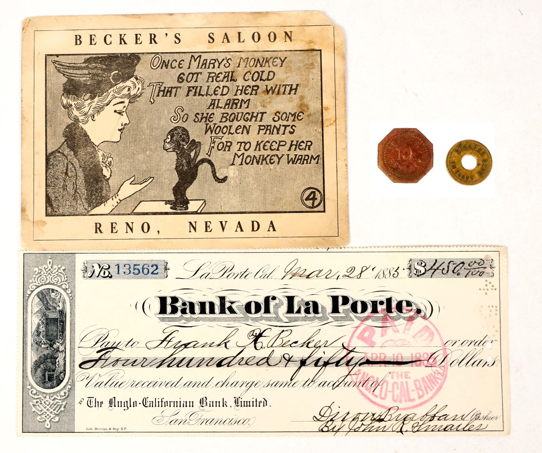 Lot of 4. Includes: fantastic pictorial advertising paper piece (approx. 4 x 6") advertising Becker's Saloon in Reno; two different self-identified tokens for Becker's, including a very rare octagonal piece; and 1885 Bank of La Porte check issued to Frank H. Becker. The 3 Becker brothers combined forces and started an early brewery in Washoe City, and later more breweries. They opened a saloon in Reno in 1868. Heidtmann took over Becker's Saloon in Reno at the end of 1900. See Volume 1 of the Nevada Bottle Book.