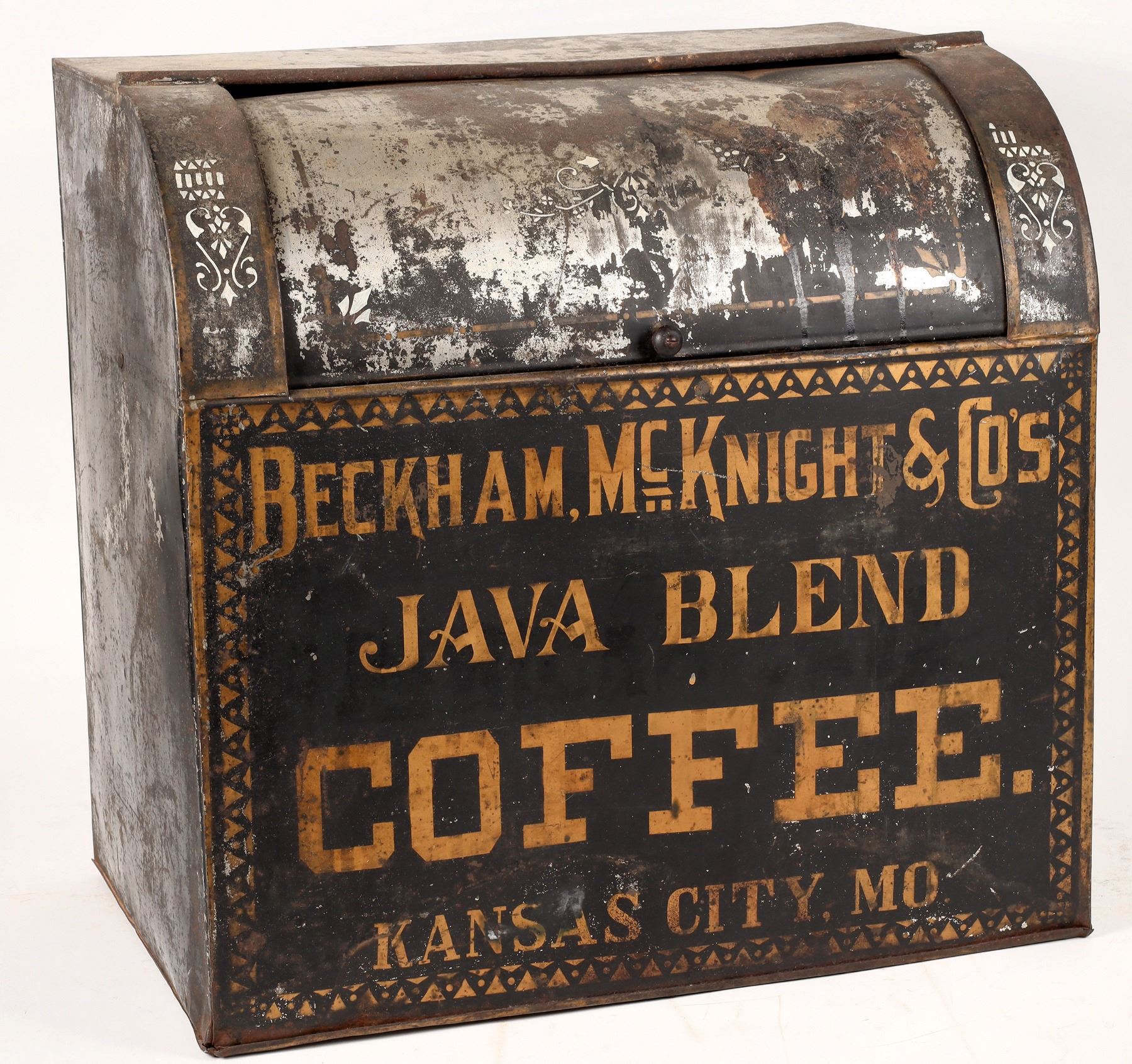 Coffee box for store counter display of Beckham, McKnight & Company's Java Blend of Kansas City, Missouri. Piece measures 19"x 18"x 13" and is clearly stenciled in the front. The sliding door still works. This is a very nice piece, ready for display. Please see photos for more details. Kansas City Missouri Gary Bracken Collection