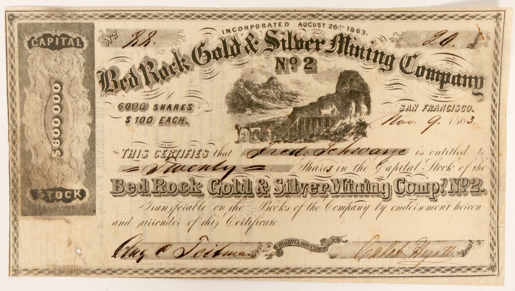 # 88 for 20 shares to Fred Schwarze. Signed by August Teitman and president Caleb Hyatt. (These are the same names on a certificate we sold earlier for the Bed Rock No. 1) Dateline 1863 San Francisco. Incorporated August 26, 1863. "Virginia District on ribbon on center bottom." Not cancelled. Mining tunnel With carts and wagons unloading rock vignette. Butler's printer. Hole left bottom. Light discoloration throughout. Heavy black on white. Not listed on Bancroft 1862, Collins 1864 or mentioned in other Holabird research materials. According to McDonald, their office was located in S.F. at 611 Clay St. and the secretary was A.C. Teitman [McDonald, pg. 17, 1996]. May have been prospective company. Their name is unusual in that it refers more to Gold Rush-style mining. Where is there a river on the Comstock?? Ken Prag Collection