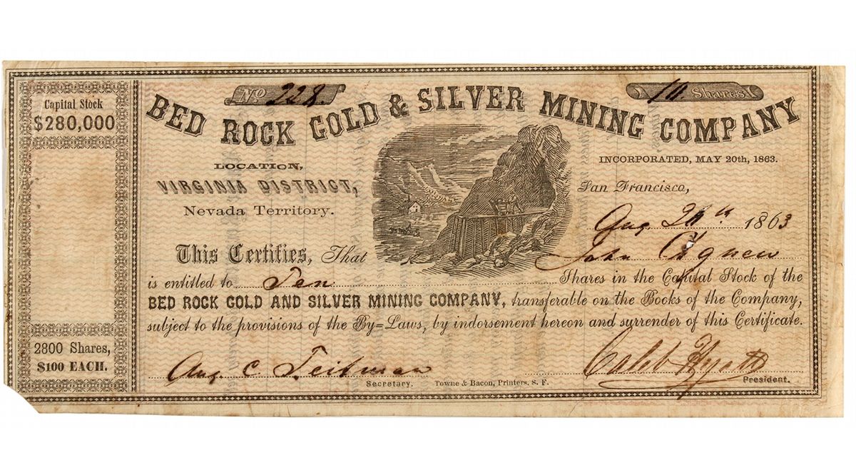 1863. Territorial. Incorporated May 20th, 1863. Location: Virginia District, Nevada Territory. Certificate # 228. Uncancelled. Issued for ten shares to John Agneu on August 26th, 1863. Signed by Caleb Hyatt (president) and Aug. C Teilman (?) (secretary). Datelined San Francisco. Vignette in center of mountain scene: miner pushing ore cart on track out of mine, with stagecoach and building in background. Printed by Towne & Bacon, Printers S.F. Very delicate paper. Small holes on right and left sides. Toning. Left bottom corner missing. Extremely rare certificate. Not listed on Bancroft 1862 or mentioned in other Holabird research materials. According to McDonald, their office was located in S.F. at 611 Clay St. and the secretary was A.C. Teitman (McDoanld, pg. 17,1996). May have been prospective company. Their name is unusual in that it refers more to Gold Rush-style mining. Perhaps this site was located near a river?City: Virginia CityCounty: StoreyState: NVDate: