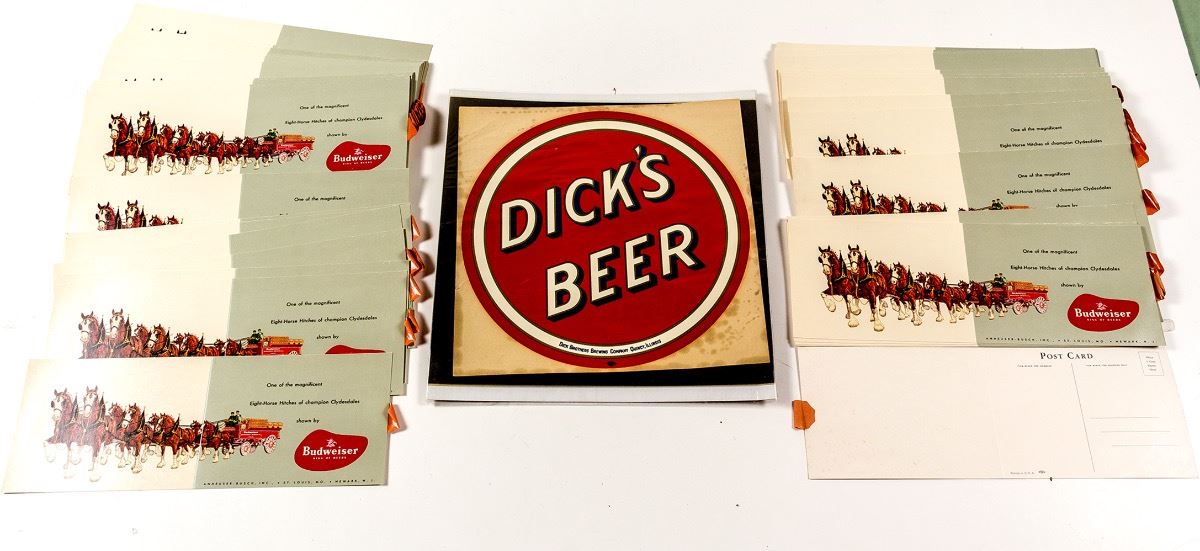 Dick's Beer, Dick Brothers Brewing Company, Quincy Illinois large sticker and group of oversized Budweiser foldable postcards--"One of the magnificent Eight-Horse Hitches of champion Clydesdales shown by Budweiser, King of Beers". City: State: Date: Inventory# 38614