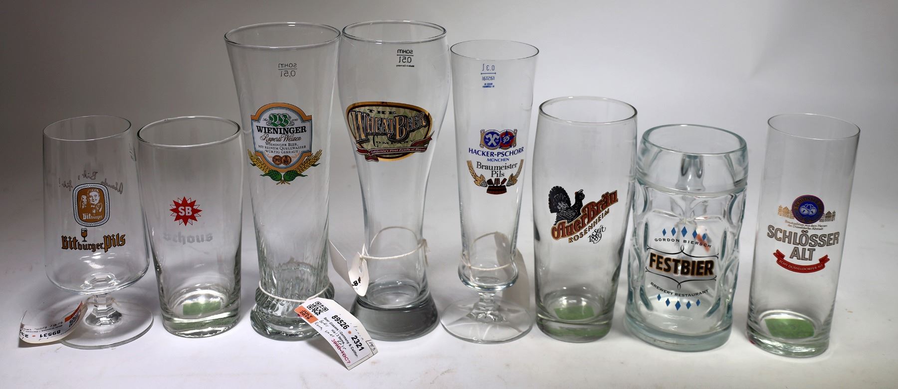 Lot of 12 beer glasses from different breweries. Most appear to be from Germany. Please see photo for more details. Various sizes, average is about 7.5 inches tall. All are in good condition.