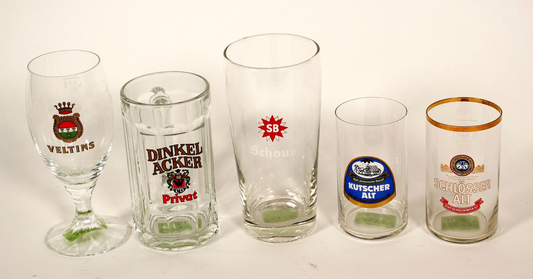Item #1 of 5: Motif: Double Padlock shield, in front of a town. Schlosser / Alt/ Echt Dusseldorfer Alt ( In red waving banner// 4 1/4" glass, with gold rim. Item # 2 of 5 : Motifs: Gold crown & Gold & green shield with 3 goblets/ Veltins// 6/1/2" tall, footed fluted base. // Item #3 of 5 :Motifs : Red 8 pointed star, on top of white 8 pointed star, & SB in the center/ Schous . 6 1/2" tall. // Item # 4 of 5: Dinkel / Acker/ Royal shield/ CD / Privat. 5 1/2" tall, multi sided stein // Item # 5 of 5 : Shown on a blue n gold label is : 2 horses pulling a small beer wagon / Written within a green waving banner is : Nach altrheinischer Braut/ Kutsher / Alt/ Der echte herzhaft Alt- Geschmack// 4 1/4" tall // Very nice selection of glassware , crystal that ring, in different sizes n shapes. Great display , or everyday use items. i ( RH).