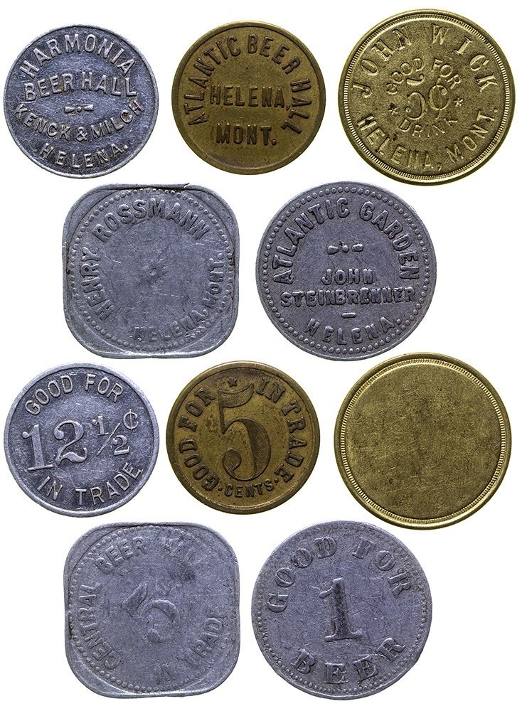 5 Tokens from various beer halls, beer gardens, and the John Wick Saloon. Highlights include an R-7 John Wick / GF / 5c / Drink / Helena, Mont. //. Round, Brass, 24mm. R-6 Atlantic Garden / John / Steinbrenner / Helena. // GF / 1 / Beer. Round, Aluminum, 25mm. R-5 Business Beer Hall / Helena / Mont. // GF / 5 Cents / IT. Round, Brass, 21mm. Other 2 Tokens include an R-5 Harmonia Beer Hall, and an R-4 Central Beer Hall. City: Helena State: Montana, Date: Inventory# 39738