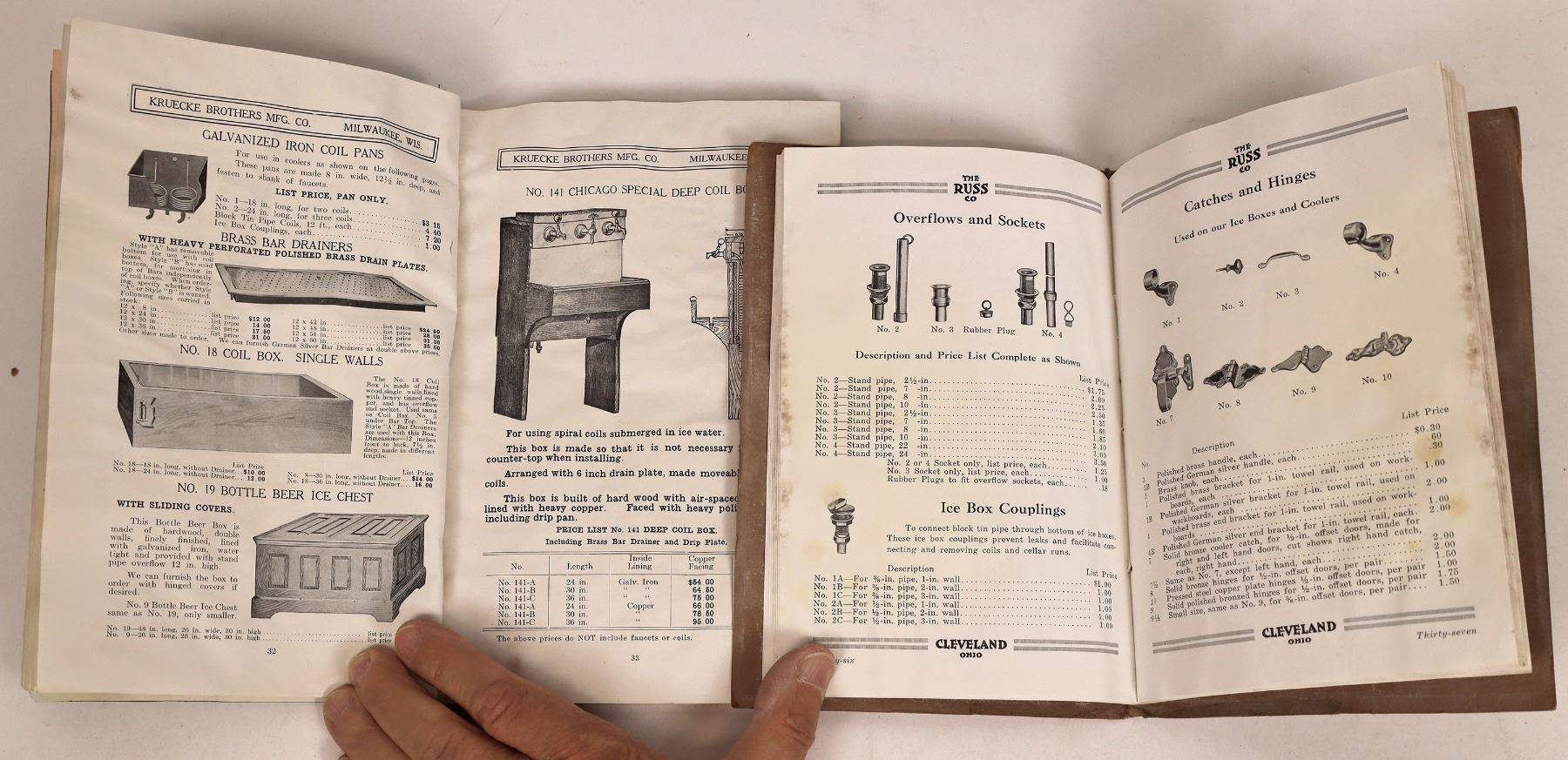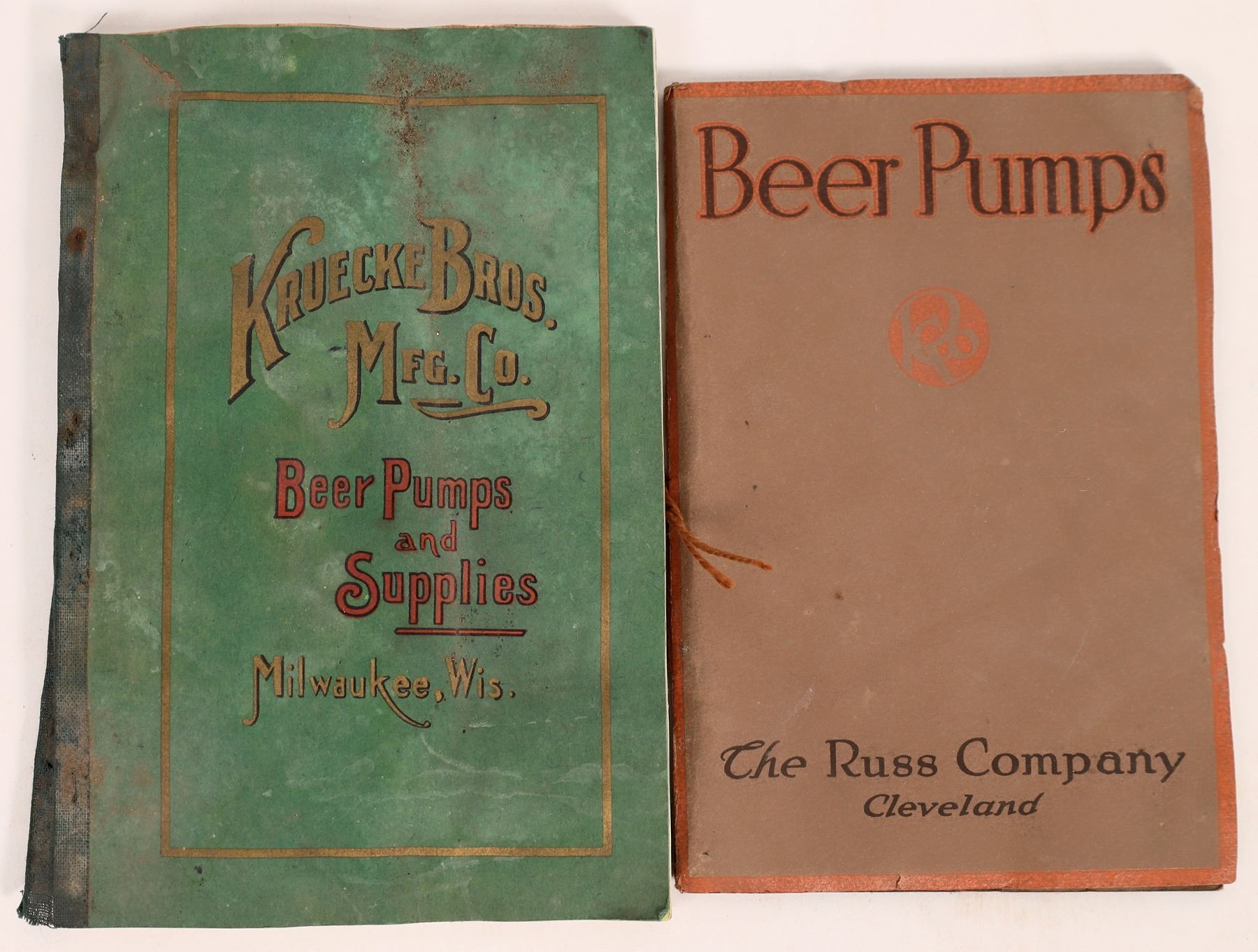 2 rare beer pumps books. The Russ Company, Cleveland, 80pp with price and illustrations of parts, some foxing mostly on side edge, front cover dogear. Kruecke Bros, Milwaukee, WI, water damage with wrinkles and many sticky pages etc. Sold as is.
