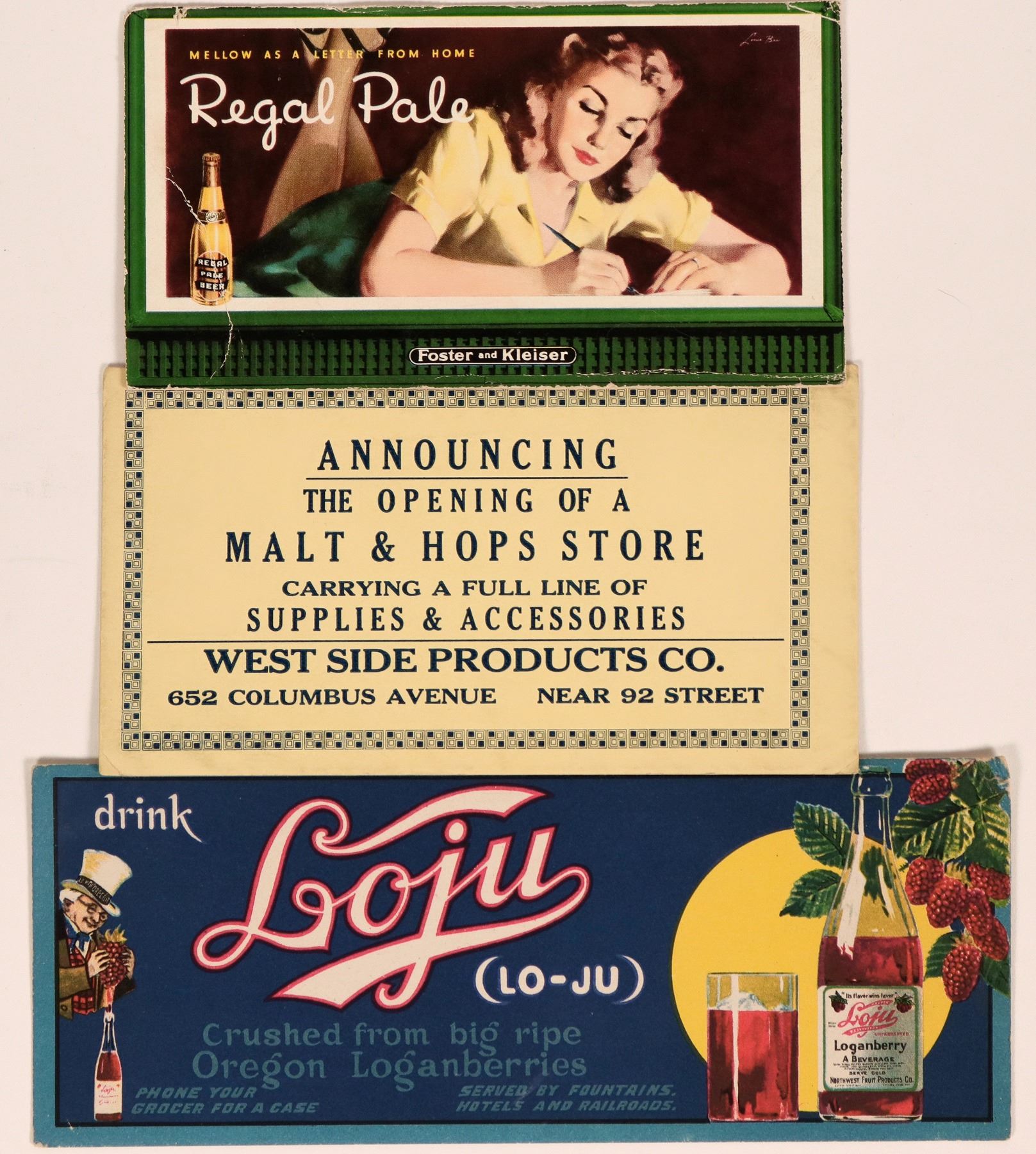 A unique group of advertising blotters for beer & hops. One blotter announces the opening of a malt & hops store, West Side Products Co. Another blotter advertises Regal Pale Beer from Foster and Kleiser and features a woman casually lying on her stomach, propped up on her elbows penning a letter. Also includes a blotter advertisement for Loju, a loganberry beverage.