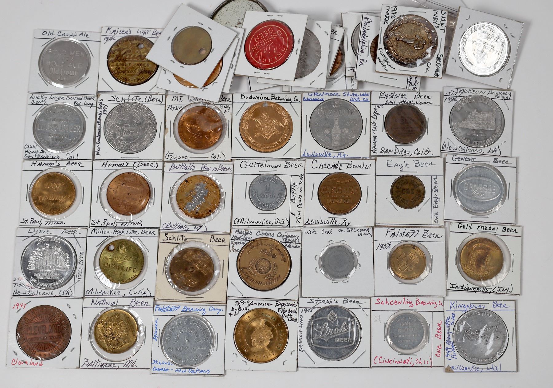 About 50 beer souvenir tokens. Stroh's, Jackson Brewery, Genesee, Eastside Beer, Falstaff Beer, Kaiser's, Lion Beer advertising mirror, Primo Hawaiian Beer, Mt. Whitney Beer etc.