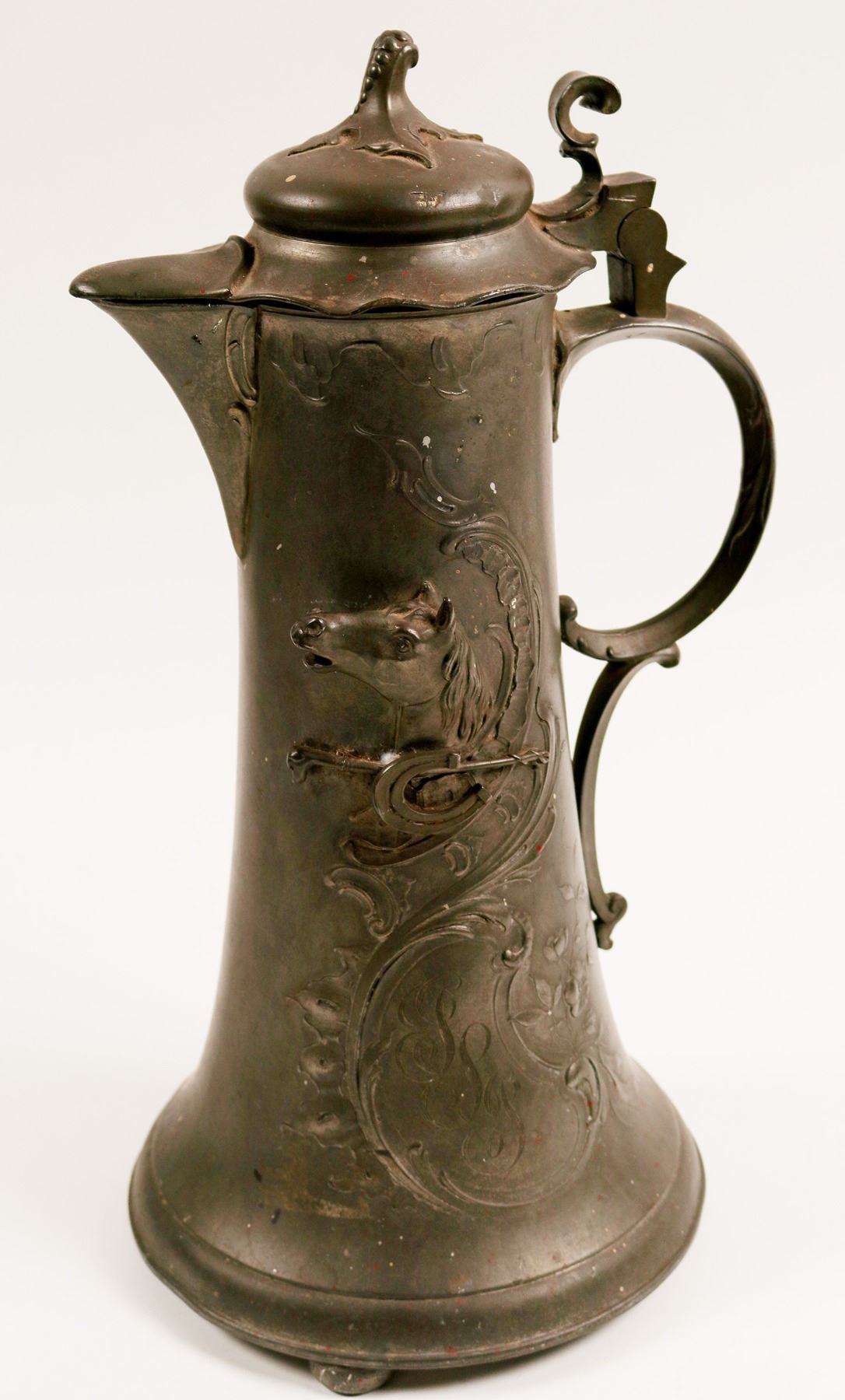 Beautiful, art nouveau pewter beer stein. This item was used to serve beer, from a the tap. 14 1/4" Tall x 7 1/4" at the base. This stein has a lid with a plant end. The lids were added to beer steins, to keep the flies away, while serving beer outside, in beer gardens. Embossed with a relief of a horses head, a walking cane with a dogs head, and a horse shoe. So when they drank beer from this pitcher and went hunting, with their dogs, they would have good luck. Also has the initials " SSS", signifying the original owners title, of name. Plus, floral designs . Embossed on the base in an circle is : 18/ Kayserzinn / 4039 /. The Kayser firm started with the #4000, so this is an early piece. By 1925, the number had reached 4, 999. The owner Englebert Kayser died in 1911. Great center piece for a table, or your mantel. Perfect condition. ( RH).