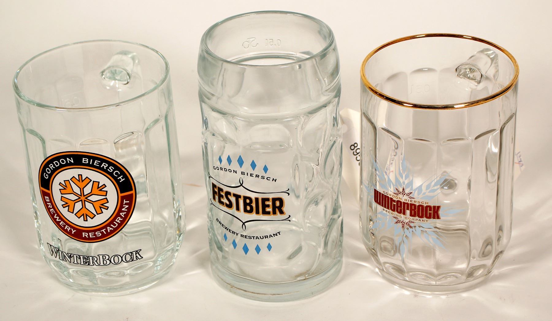 Item #1 of 3: Motif: 5 Diamonds ( cu) / Fancy looped design ( pointed up ) / Festbier / Fancy looped design ( Pointed down ) Brewery Restaurant( ad ) Motif : 5 Diamonds Thumb print designed body. 6 1/2" tall, perfect condition.// Item # 2 of 3: Embossed on a black, brown, & gold round stenciled label is : Gordon Biersch ( au ) Motif : 6 piece design / Brewery Restaurant ( ad ) / WinterBock. / Multi-ribbed design, on the inside of the body, very unusual. 5 1/2" tall , perfect condition. Item # 3 of 3: 3 leaf flora design ( Pointing up) / Gordon Biersch/ Winetbock ( Single leafed at ends)/ Brewing Company / 3 leafed design ( Pointing down) Multi ribbed on the inside of the body, and has gold trim on the rim !! Perfect condition. Very nice trio of steins, from the same company, in different designs and sizes.( RH).
