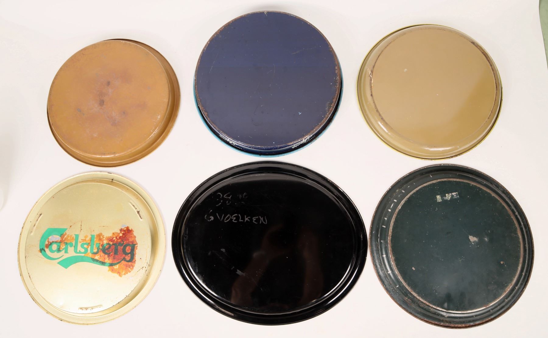 5 different beer trays. 12" South Pacific Lager c. 1952-some rust. Oval 16.5" Stag Brewery, Belleville, Illinois. 13" Carlsberg-some rust. 13" Cruz Blanca-a few edge chips. 13.5" Clara Ambarina-moderate rust.13.5" Enterprise Brewing, San Francisco-rust and wear.